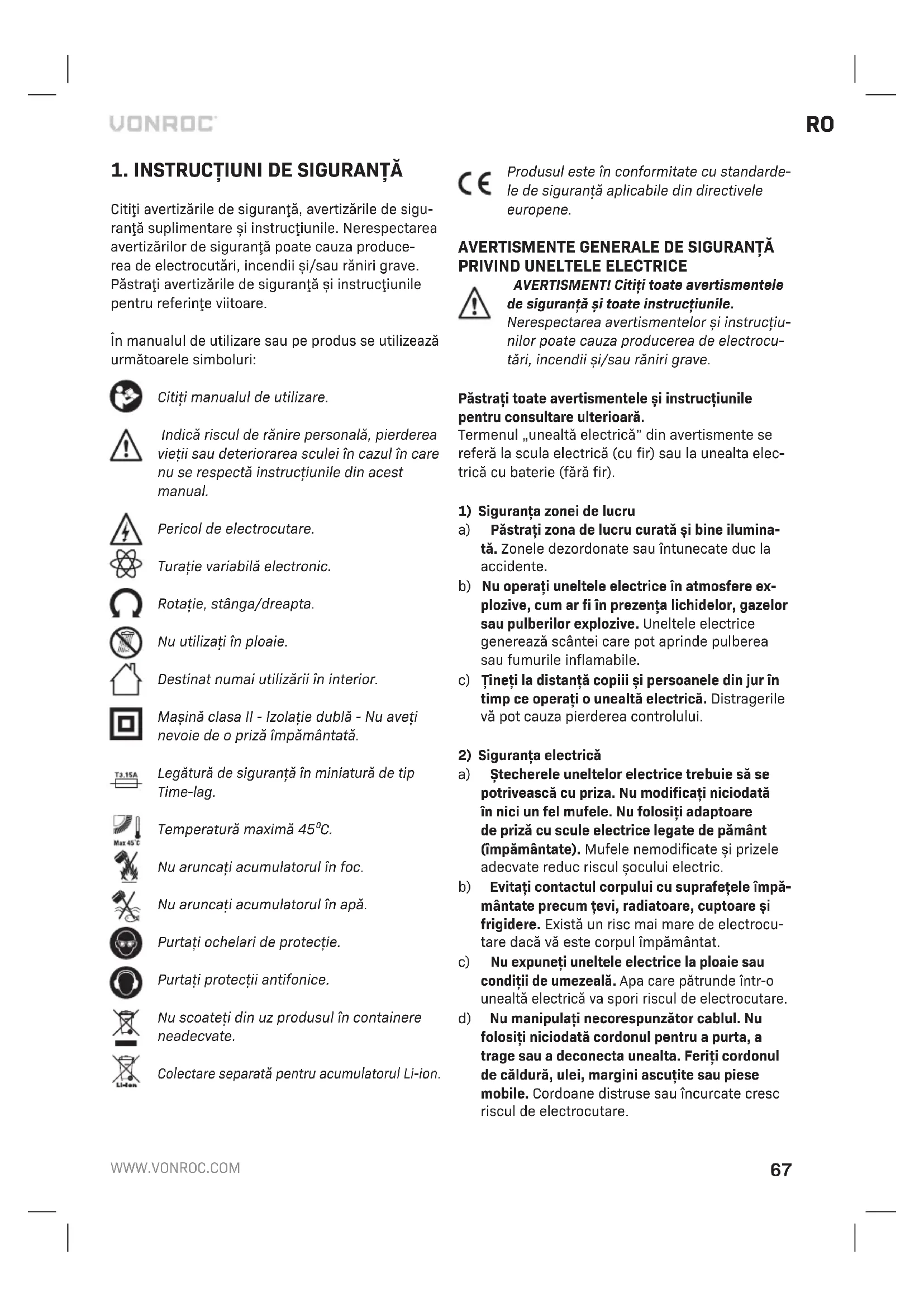 Înainte de curăţare şi întreţinere, opriţi alimentarea electrică a maşinii şi scoateţi acumulatorul din maşină. Curăţaţi regulat carcasa cu o cârpă moale, de pre- ferat după fiecare utilizare. Asiguraţi-vă că fantele de aerisire sunt lipsite de praf şi murdărie. Îndepărtaţi murdăria persistentă cu o cârpă moale înmuiată în clăbuci de săpun. Nu folosiţi solvenţi precum benzină, alcool, amoniac etc. Astfel de substanţe chimice vor deteriora componentele sintetice. MEDIU Aparatele electrice sau electronice deteriorate şi/sau defecte trebuie colectate în locurile de reciclare corespunzătoare. Numai pentru ţările din CE Nu aruncaţi echipamentele acţionate electric îm- preună cu gunoiul menajer. Conform Indicaţiei eu- ropene 2012/19/CE pentru echipamente electrice şi electronice uzate şi a implementării sale la nivel naţional, echipamentele acţionate electric scoase din uz trebuie colectate separat şi evacuate într-o manieră ecologică. GARANŢIE Produsele VONROC sunt realizate la cele mai înalte standarde de calitate şi sunt garantate în privinţa materialelor şi a manoperei pentru întreaga perioa- dă de utilizare în garanţie, începând cu data achizi- ţiei. În cazul în care produsul prezintă defecţiuni în perioada de garanţie din cauza materialului defect şi/sau a manoperei, contactaţi direct VONROC. Următoarele circumstanţe sunt excluse de la această garanţie: