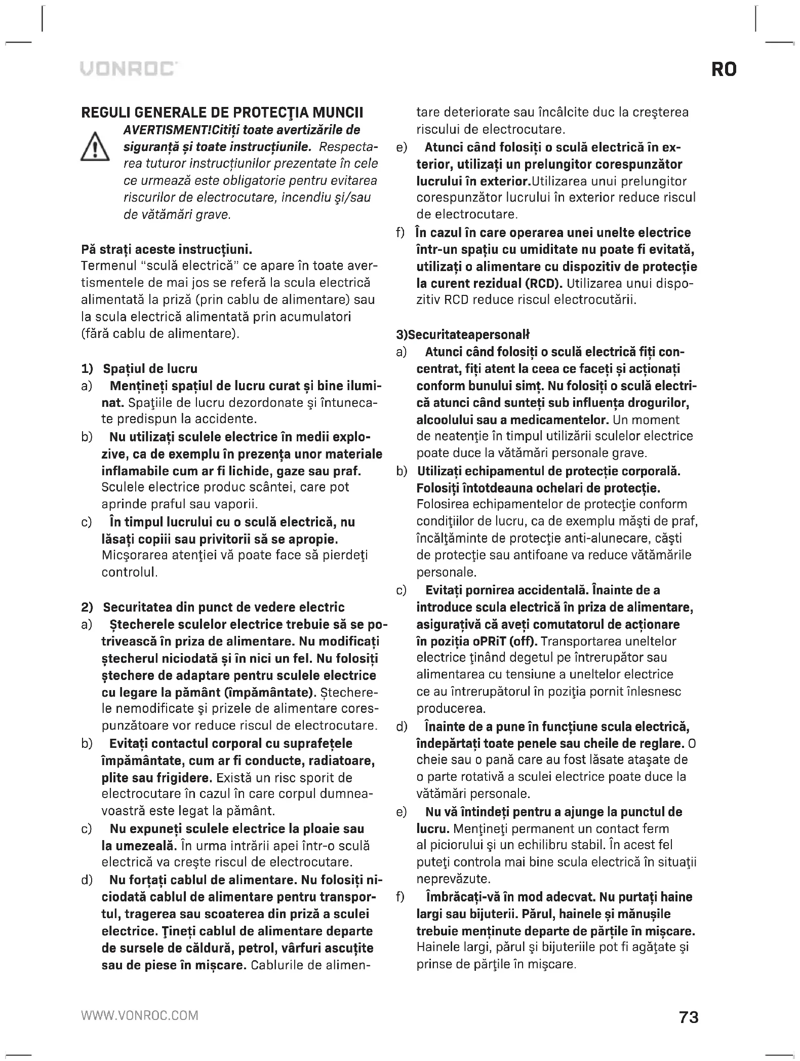 Înante de curăare ş întrenere, opr almentarea electrcă a maşn ş deconec- ta fşa cablulu de almentare de la prza de reea. Curăa regulat carcasa cu o cârpă moale, de preferat după fecare utlzare. Curăa fantele de aersre de praf ş murdăre. Îndepărta murdăra persstentă cu o cârpă moale înmuată în clăbuc de săpun. Nu folos solven precum benznă, alcool, amonac, etc. Astfel de substane chmce vor dete- rora componentele sntetce. MEDIU Aparatele electrice sau electronice deteriorate și/sau defecte trebuie colectate în locurile de reciclare corespunzătoare. Numai pentru ările din CE Nu aruncai echipamentele acionate electric îm- preună cu gunoiul menajer. Conform Indicaiei eu- ropene 2012/19/EU pentru echipamente electrice și electronice uzate și a implementării sale la nivel naional, echipamentele acionate electric scoase din uz trebuie colectate separat și evacuate într-o manieră ecologică. GARANIE Produsele VONROC sunt realizate la cele mai înalte standarde de calitate și sunt garantate în privina materialelor și a manoperei pentru întreaga perioadă de utilizare în garanie, începând cu data achiziiei. În cazul în care produsul se defectează în timpul perioadei de utilizare, contactai direct VONROC. Următoarele circumstane sunt excluse de la această garanie: