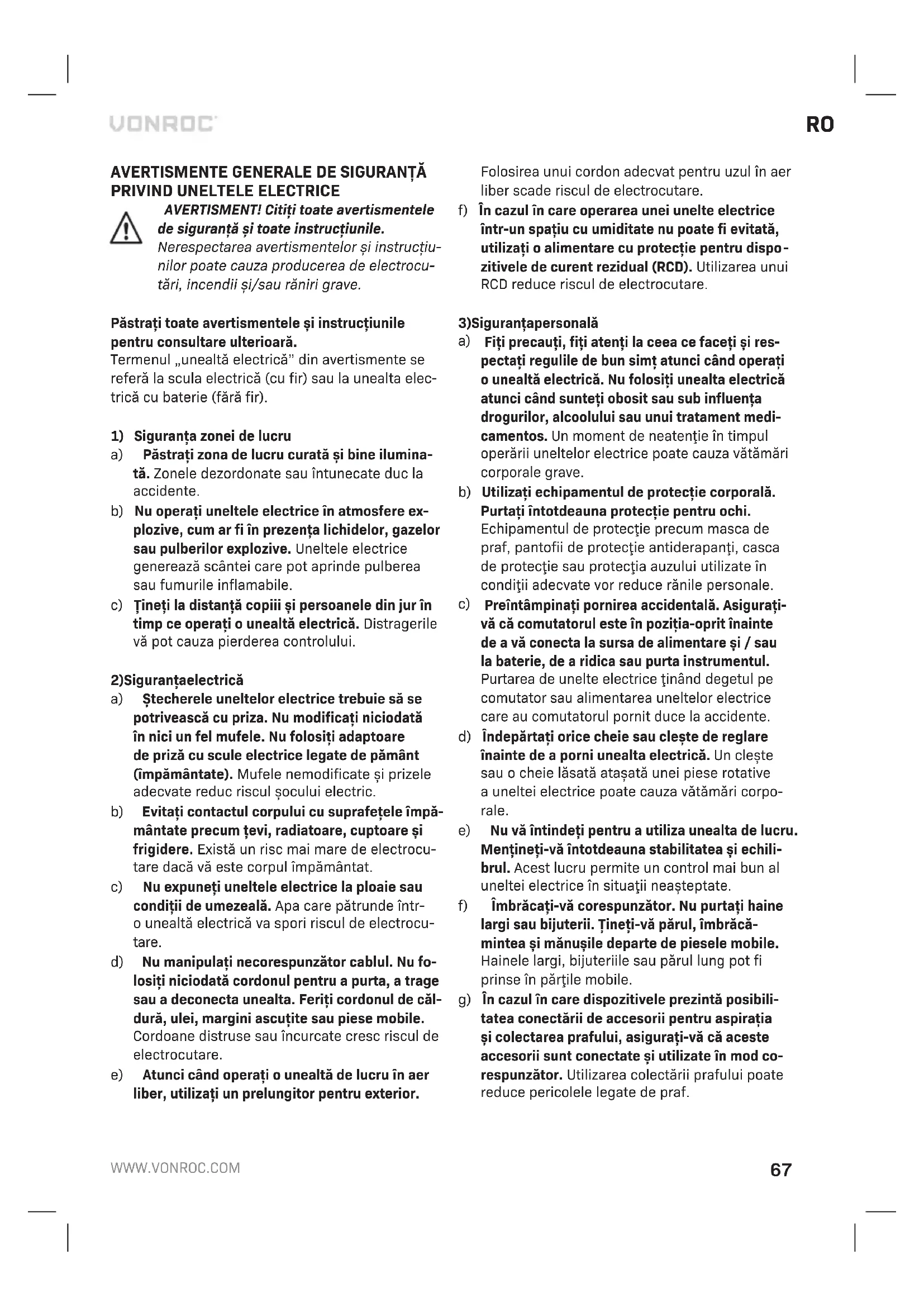 Deconectaţi întotdeauna maşina de la sursa principală de alimentare înainte de aefectua întreţinerea. Curăţaţi regulat carcasa cu ocârpă moale, de preferat după fiecare utilizare. Curăţaţi fantele de aerisire de praf şi murdărie. Îndepărtaţi murdăria persistentă cu ocârpă moale înmuiată în clăbuci de săpun. Nu folosiţi solvenţi precum benzină, alcool, amoniac etc. Astfel de sub- stanţe chimice vor deteriora componentele sintetice. MEDIU Aparatele electrice sau electronice deteriorate şi/sau defecte trebuie colectate în locurile de reciclare corespunzătoare. Numai pentru ţările din CE Nu aruncaţi echipamentele acţionate electric împreună cu gunoiul menajer. Conform Indicaţiei europene 2012/19/EC pentru echipamente electrice şi electronice uzate şi aimplementării sale la nivel naţional, echipamentele acţionate electric scoase din uz trebuie colectate separat şi evacuate într-omani- eră ecologică. GARANŢIE Produsele VONROC sunt realizate la cele mai înalte standarde de calitate şi sunt garantate în privinţa materialelor şi amanoperei pentru întreaga perioa- dă de utilizare în garanţie, începând cu data achizi- ţiei. În cazul în care produsul prezintă defecţiuni în perioada de garanţie din cauza materialului defect şi/sau amanoperei, contactaţi direct VONROC. Următoarele circumstanţe sunt excluse de la această garanţie:
