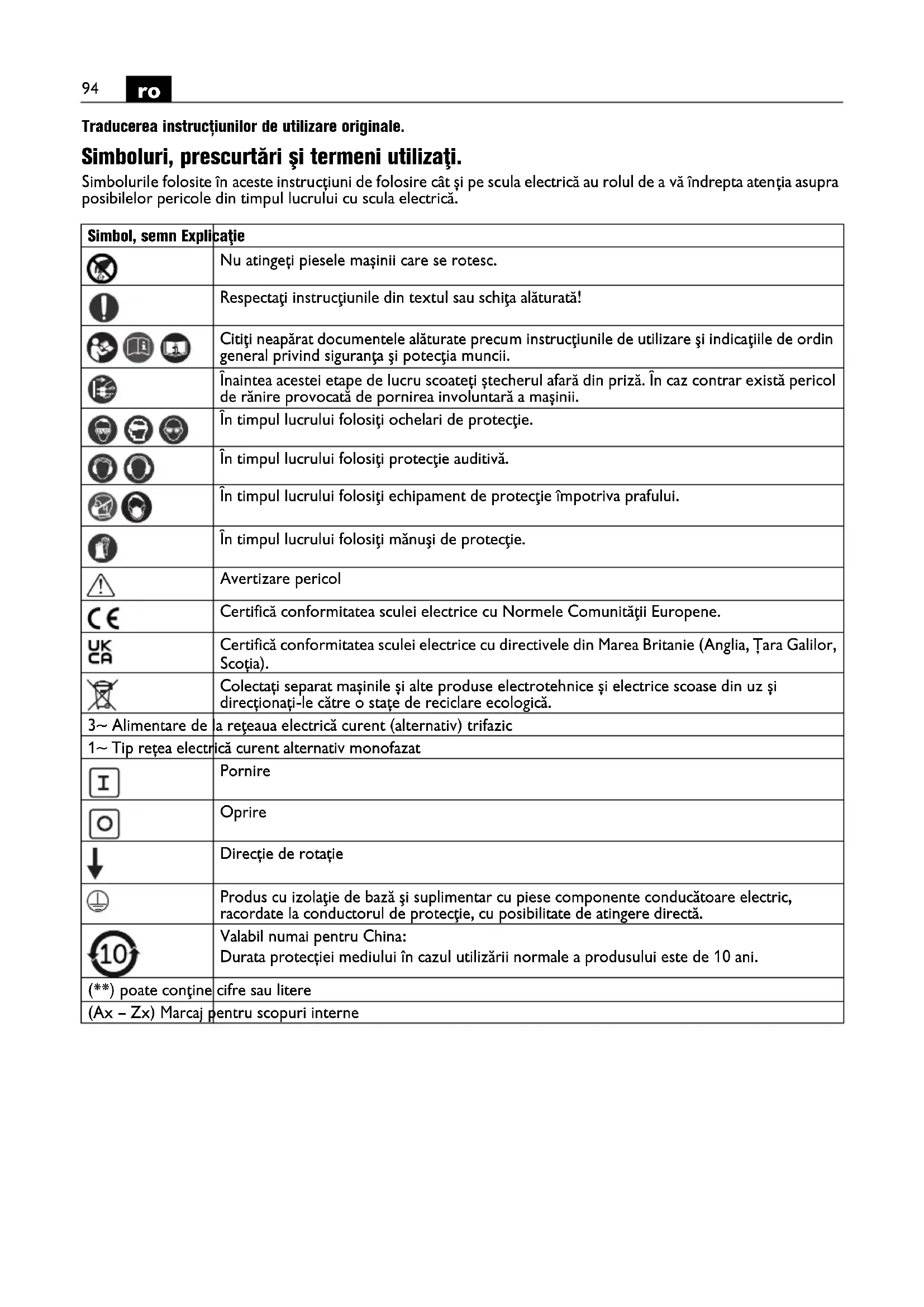 Traducerea instrucțiunilor de utilizare originale. Simboluri, prescurtări şi termeni utilizaţi. Simbolurile folosite în aceste instrucțiuni de folosire cât și pe scula electrică au rolul de a vă îndrepta atenția asupra posibilelor pericole din timpul lucrului cu scula electrică. Simbol, semn Explicaţie Nu atingeți piesele mașinii care se rotesc. Respectaţi instrucţiunile din textul sau schiţa alăturată! Citiţi neapărat documentele alăturate precum instrucţiunile de utilizare şi indicaţiile de ordin general privind siguranţa şi potecţia muncii. Înaintea acestei etape de lucru scoateți ștecherul afară din priză. În caz contrar există pericol de rănire provocată de pornirea involuntară a mașinii. În timpul lucrului folosiţi ochelari de protecţie. În timpul lucrului folosiţi protecţie auditivă. În timpul lucrului folosiţi echipament de protecţie împotriva prafului. În timpul lucrului folosiţi mănuşi de protecţie. Avertizare pericol Certifică conformitatea sculei electrice cu Normele Comunităţii Europene. Certifică conformitatea sculei electrice cu directivele din Marea Britanie (Anglia, Țara Galilor, Scoția). Colectați separat mașinile și alte produse electrotehnice și electrice scoase din uz și direcționați-le către o stațe de reciclare ecologică. 3~ Alimentare de la reţeaua electrică curent (alternativ) trifazic 1~ Tip rețea electrică curent alternativ monofazat Pornire Oprire Direcție de rotație Produs cu izolaţie de bază şi suplimentar cu piese componente conducătoare electric, racordate la conductorul de protecţie, cu posibilitate de atingere directă. Valabil numai pentru China: Durata protecției mediului în cazul utilizării normale a produsului este de 10 ani. (**) poate conţine cifre sau litere (Ax – Zx) Marcaj pentru scopuri interne95