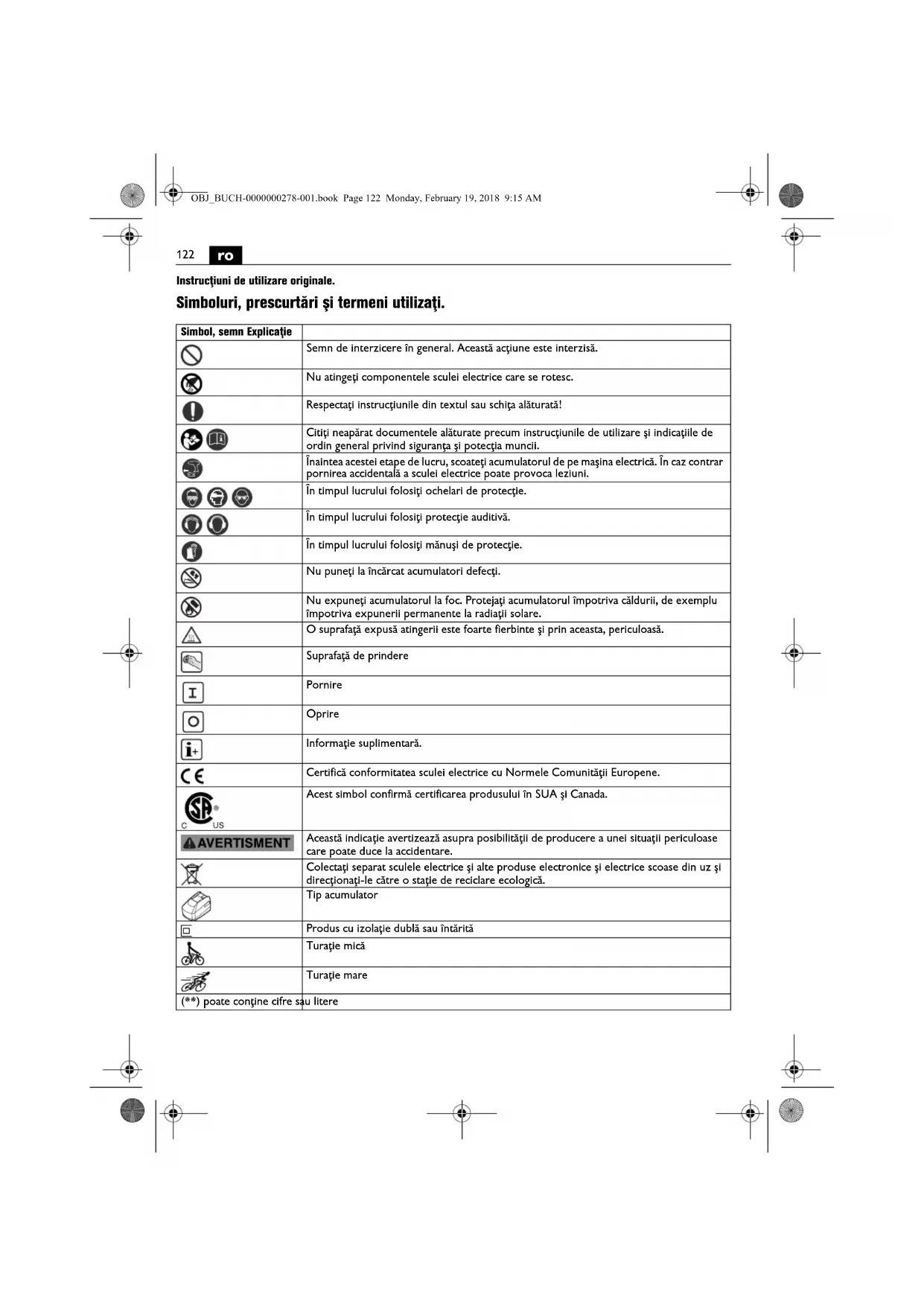 Instrucţiuni de utilizare originale. Simboluri, prescurtări şi termeni utilizaţi. Simbol, semn Explicaţie Semn de interzicere în general. Această acţiune este interzisă. Nu atingeţi componentele sculei electrice care se rotesc. Respectaţi instrucţiunile din textul sau schiţa alăturată! Citiţi neapărat documentele alăturate precum instrucţiunile de utilizare şi indicaţiile de ordin general privind siguranţa şi potecţia muncii. Înaintea acestei etape de lucru, scoateţi acumulatorul de pe maşina electrică. În caz contrar pornirea accidentală a sculei electrice poate provoca leziuni. În timpul lucrului folosiţi ochelari de protecţie. În timpul lucrului folosiţi protecţie auditivă. În timpul lucrului folosiţi mănuşi de protecţie. Nu puneţi la încărcat acumulatori defecţi. Nu expuneţi acumulatorul la foc. Protejaţi acumulatorul împotriva căldurii, de exemplu împotriva expunerii permanente la radiaţii solare. O suprafaţă expusă atingerii este foarte fierbinte şi prin aceasta, periculoasă. Suprafaţă de prindere Pornire Oprire Informaţie suplimentară. Certifică conformitatea sculei electrice cu Normele Comunităţii Europene. Acest simbol confirmă certificarea produsului în SUA şi Canada. Această indicaţie avertizează asupra posibilităţii de producere a unei situaţii periculoase care poate duce la accidentare. Colectaţi separat sculele electrice şi alte produse electronice şi electrice scoase din uz şi direcţionaţi-le către o staţie de reciclare ecologică. Tip acumulator Produs cu izolaţie dublă sau întărită Turaţie mică Turaţie mare (**) poate conţine cifre sau litere OBJ_BUCH-0000000278-001.book Page 122 Monday, February 19, 2018 9:15 AM123