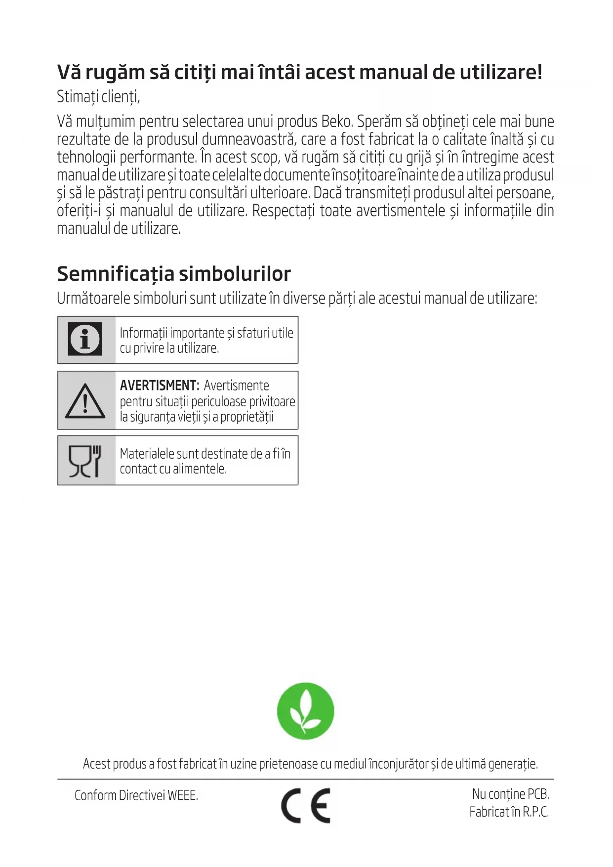 Użytkownikowi dodatkowo i nie wyłącza, nie ogranicza ani nie zawiesza uprawnień Użytkownika wynikających z przepisów o rękojmi za wady rzeczy sprzedanej na podstawie Kodeksu cywilnego.Vă rugăm să citiţi mai întâi acest manual de utilizare! Stmaţ clenţ, Vă mulţumm pentru selectarea unu produs Beko. Sperăm să obţneţ cele ma bune rezultate de la produsul dumneavoastră, care a fost fabrcat la o caltate înaltă ş cu tehnolog performante. În acest scop, vă rugăm să ctţ cu grjă ş în întregme acest manual de utlzare ş toate celelalte documente însoţtoare înante de a utlza produsul ş să le păstraţ pentru consultăr ulteroare. Dacă transmteţ produsul alte persoane, oferţ- ş manualul de utlzare. Respectaţ toate avertsmentele ş nformaţle dn manualul de utlzare. Semnificaţia simbolurilor Următoarele smbolur sunt utlzate în dverse părţ ale acestu manual de utlzare: