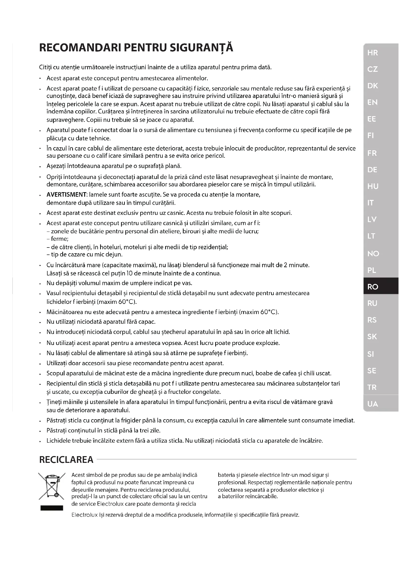 Acest aparat este conceput pentru amestecarea alimentelor. Acest aparat poate f i utilizat de persoane cu capacități f izice, senzoriale sau mentale reduse sau fără experiență și cunoștințe, dacă benef iciază de supraveghere sau instruire privind utilizarea aparatului într-o manieră sigură și înțeleg pericolele la care se expun. Acest aparat nu trebuie utilizat de către copii. Nu lăsați aparatul și cablul său la îndemâna copiilor. Curățarea și întreținerea în sarcina utilizatorului nu trebuie efectuate de către copii fără supraveghere. Copiii nu trebuie să se joace cu aparatul. Aparatul poate f i conectat doar la o sursă de alimentare cu tensiunea și frecvența conforme cu specif icațiile de pe plăcuța cu date tehnice. În cazul în care cablul de alimentare este deteriorat, acesta trebuie înlocuit de producător, reprezentantul de service sau persoane cu o calif icare similară pentru a se evita orice pericol. Așezați întotdeauna aparatul pe o suprafață plană. Opriți întotdeauna și deconectați aparatul de la priză când este lăsat nesupravegheat și înainte de montare, demontare, curățare, schimbarea accesoriilor sau abordarea pieselor care se mișcă în timpul utilizării. AVERTISMENT: lamele sunt foarte ascuțite. Se va proceda cu atenție la montare, demontare după utilizare sau în timpul curățării. Acest aparat este destinat exclusiv pentru uz casnic. Acesta nu trebuie folosit în alte scopuri. Acest aparat este conceput pentru utilizare casnică și utilizări similare, cum ar f i: – zonele de bucătărie pentru personal din ateliere, birouri și alte medii de lucru; – ferme; – de către clienți, în hoteluri, moteluri și alte medii de tip rezidențial; – tip de cazare cu mic dejun. Cu încărcătură mare (capacitate maximă), nu lăsaţi blenderul să funcționeze mai mult de 2 minute. Lăsați să se răcească cel puțin 10 de minute înainte de a continua. Nu depășiți volumul maxim de umplere indicat pe vas. Vasul recipientului detașabil și recipientul de sticlă detașabil nu sunt adecvate pentru amestecarea lichidelor f ierbinți (maxim 60°C). Măcinătoarea nu este adecvată pentru a amesteca ingrediente f ierbinți (maxim 60°C). Nu utilizați niciodată aparatul fără capac. Nu introduceți niciodată corpul, cablul sau ștecherul aparatului în apă sau în orice alt lichid. Nu utilizați acest aparat pentru a amesteca vopsea. Acest lucru poate produce explozie. Nu lăsați cablul de alimentare să atingă sau să atârne pe suprafețe f ierbinți. Utilizați doar accesorii sau piese recomandate pentru acest aparat. Scopul aparatului de măcinat este de a măcina ingrediente dure precum nuci, boabe de cafea și chili uscat. Recipientul din sticlă și sticla detașabilă nu pot f i utilizate pentru amestecarea sau măcinarea substanțelor tari și uscate, cu excepția cuburilor de gheață și a fructelor congelate. Țineți mâinile și ustensilele în afara aparatului în timpul funcționării, pentru a evita riscul de vătămare gravă sau de deteriorare a aparatului. Păstrați sticla cu conținut la frigider până la consum, cu excepția cazului în care alimentele sunt consumate imediat. Păstrați conținutul în sticlă până la trei zile. Lichidele trebuie încălzite extern fără a utiliza sticla. Nu utilizați niciodată sticla cu aparatele de încălzire. RECICLAREA Electrolux își rezervă dreptul de a modica produsele, informațiile și specicațiile fără preaviz. Acest simbol de pe produs sau de pe ambalaj indică faptul că produsul nu poate aruncat împreună cu deșeurile menajere. Pentru reciclarea produsului, predați-l la un punct de colectare ocial sau la un centru de service Electrolux care poate demonta și recicla bateria și piesele electrice într-un mod sigur și profesional. Respectați reglementările naționale pentru colectarea separată a produselor electrice și a bateriilor reîncărcabile.HR