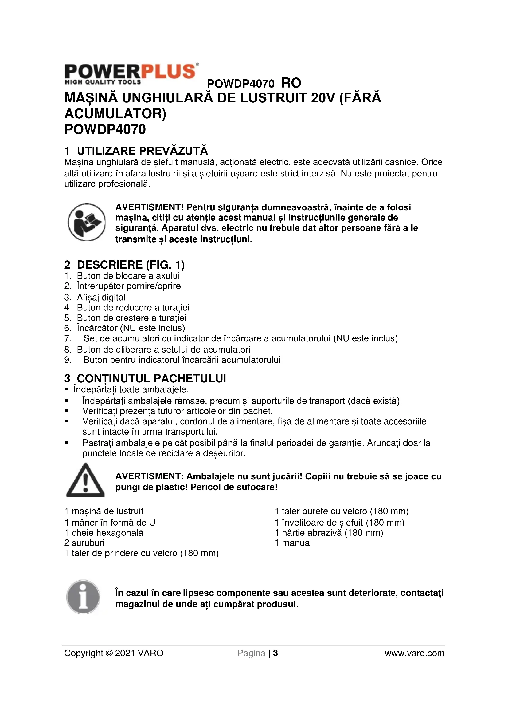 VARO N.V. - Vic. Van Rompuy N.V. Joseph Van Instraat 9 - BE2500 Lier - BELGIA, declară că produsul: Mașină unghiulară de lustruit marcă înregistrată: POWERplus model: POWDP4070 este în conformitate cu specificațiile esențiale și alte prevederi relevante ale Directivelor Europene aplicabile, pe baza aplicării standardelor europene armonizate. Orice modificare neautorizată a aparatelor atrage după sine anularea acestei declarații. Directivele europene (inclusiv, dacă este cazul, amendamentele lor, până la data semnăturii): 2011/65/EU 2006/42/EC 2014/30/EU Standardele europene armonizate (inclusiv, dacă este cazul, amendamentele lor, până la data semnăturii): EN60745-1 : 2009 EN60745-2-3 : 2011 EN55014-1 : 2017 EN55014-2 : 2015 Persoana care păstrează documentația tehnică: Philippe Vankerkhove, VARO – Vic. Van Rompuy N.V. Subsemnatul acționează în numele Directorului general executiv al societății, Ludo Mertens Certification Manager 22/12/2020, Lier - BelgiumPOWDP4070 PL Copyright © 2021 VARO Strona | 1 www.varo.com 1 PRZEZNACZENIE ............................................................................. 3 2 OPIS (RYC. 1) .................................................................................... 3