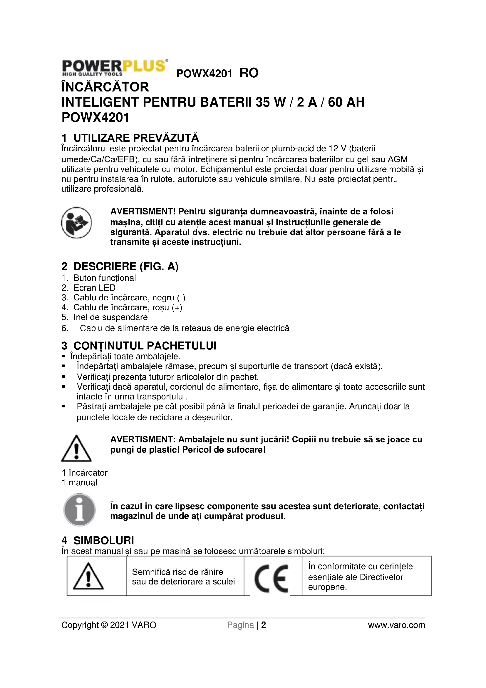 VARO-Vic. Van Rompuy N.V. - Joseph Van Instraat 9 - BE2500 Lier - BELGIA, declară că Produsul: Încărcător inteligent Marcă de comerț: POWERplus Model: POWX4201 este în conformitate cu specificațiile esențiale și alte prevederi relevante ale Directivelor Europene aplicabile, pe baza aplicării standardelor europene armonizate. Orice modificare neautorizată a aparatelor atrage după sine anularea acestei declarații. Directivele europene (inclusiv, dacă este cazul, amendamentele lor, până la data semnăturii): 2011/65/EU 2014/30/EU 2014/35/EU Standardele europene armonizate (inclusiv, dacă este cazul, amendamentele lor, până la data semnăturii): EN60335-1 : 2012 EN60335-2-29 : 2004 EN55014-1 : 2017 EN55014-2 : 2015 EN61000-3-2 : 2014 EN61000-3-3 : 2013 Persoana care păstrează documentația tehnică: Philippe Vankerkhove, VARO – Vic. Van Rompuy N.V. Subsemnatul acționează în numele Directorului general executiv al societății, Philippe Vankerkhove Divizia de reglementare – Director de conformitate Lier, 27/11/2020POWX4201 PL Copyright © 2021 VARO Strona | 1 www.varo.com 1 PRZEZNACZENIE ........................................................................... 2