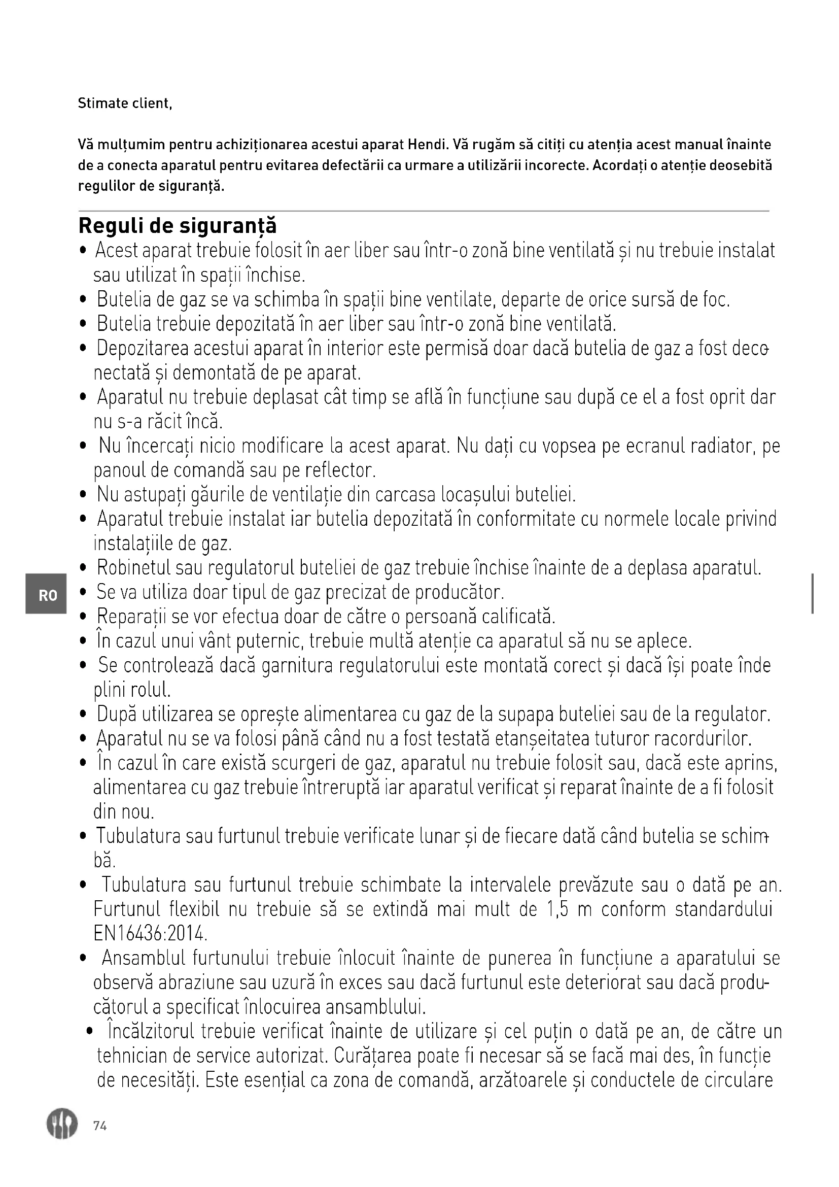 - În cazul în care există scurgeri de gaz, aparatul nu trebuie folosit sau, dacă este aprins, alimentarea cu gaz trebuie întreruptă iar aparatul verificat și reparat înainte de a fi folosit din nou.