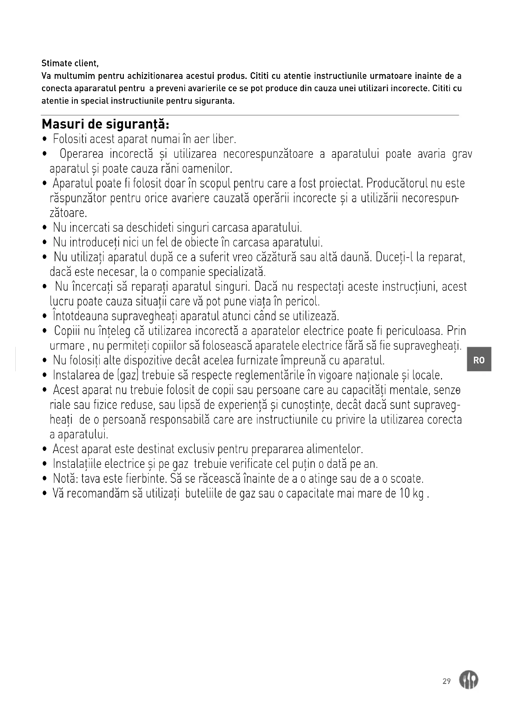 - Aparatul poate fi folosit doar în scopul pentru care a fost proiectat. Producătorul nu este răspunzător pentru orice avariere cauzată operării incorecte şi a utilizării necorespun
