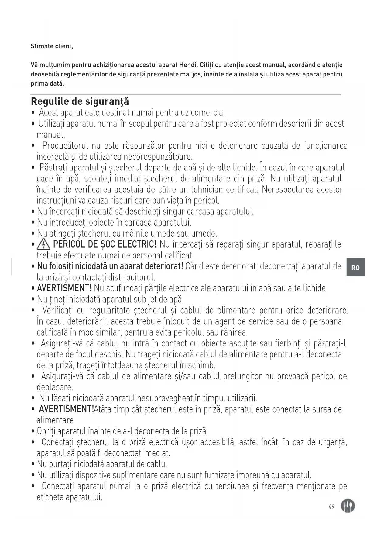 Stimate client, Vă mulțumim pentru achiziționarea acestui aparat Hendi. Citiți cu atenție acest manual, acordând o atenție deosebită reglementărilor de siguranță prezentate mai jos, înainte de a instala și utiliza acest aparat pentru prima dată. Regulile de siguranță