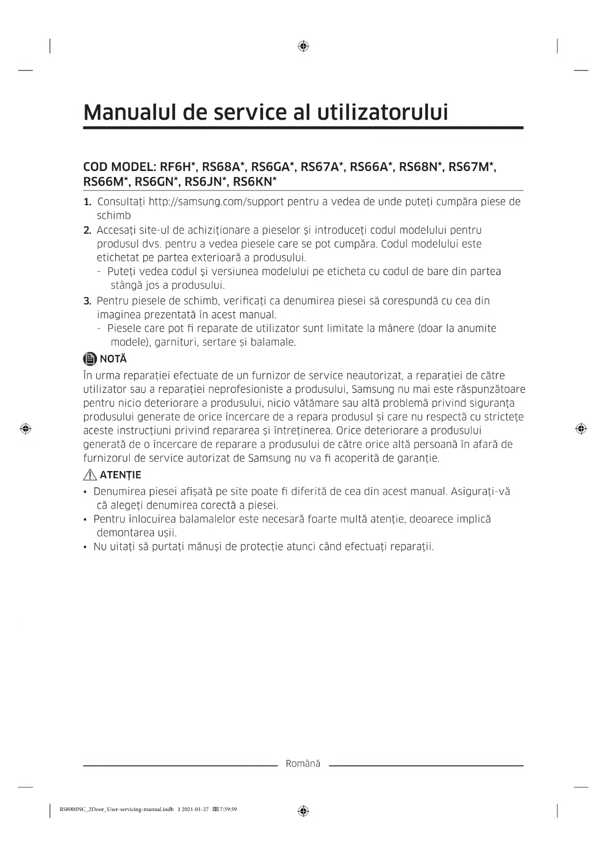 - Nu uitaţi să purtaţi mănuşi de protecţie atunci când efectuaţi reparaţii. RS8000NC_2Door_User-servicing-manual.indb 1 2021-01-27 7:39:59Română Imaginea efectivă şi piesele furnizate ale frigiderului pot diferi, în funcţie de model şi de ţară.