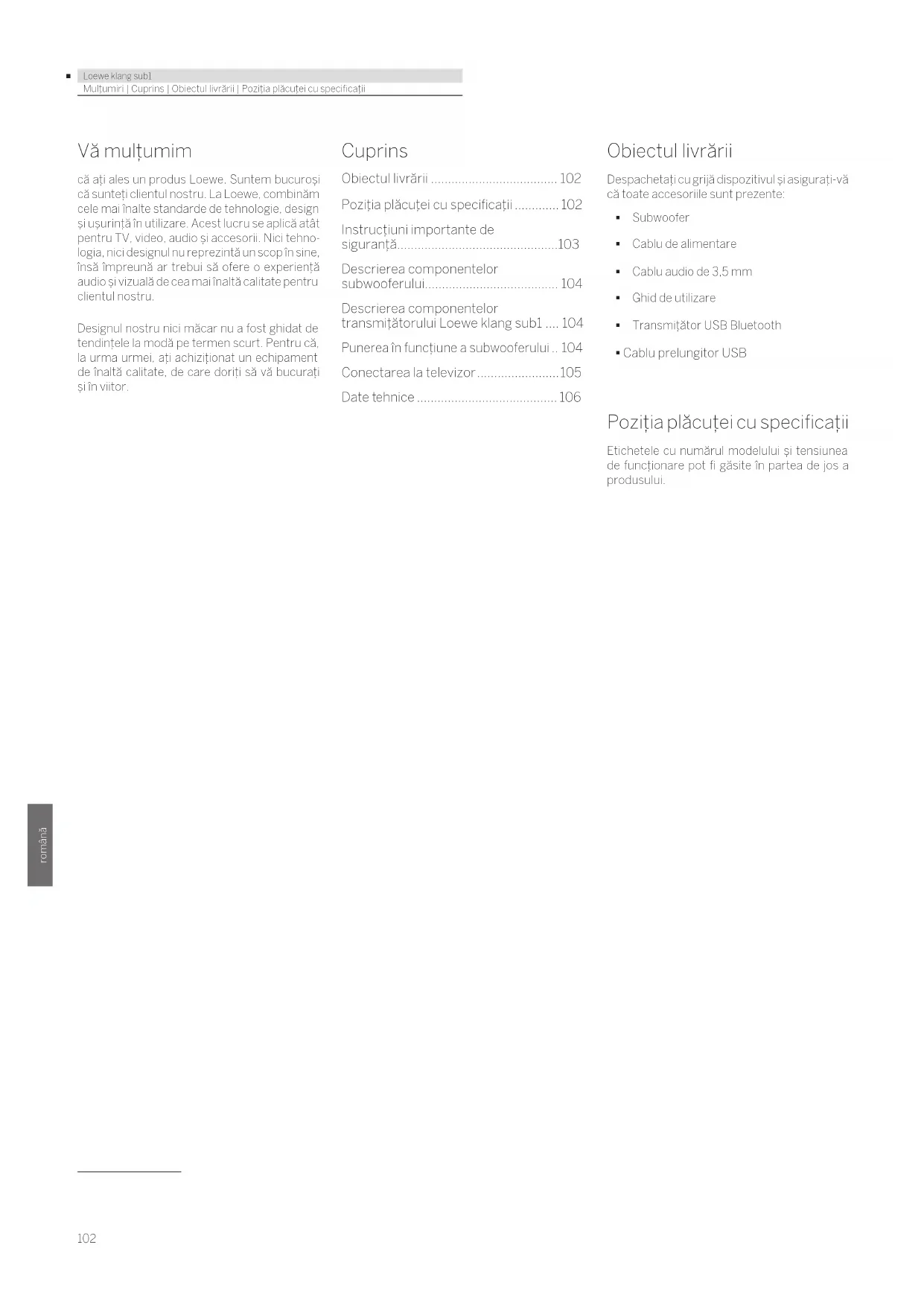 Marca verbalà s i siglele Bluetooth sunt márci inregistrate ale Bluetooth SIG Inc. s oriceutilizare a aceslor márci de calre Loewe Technology GmbH se realizează sub licentă. Altemárci commerciale si nume commerciale aparjin propietarilor respectivi.