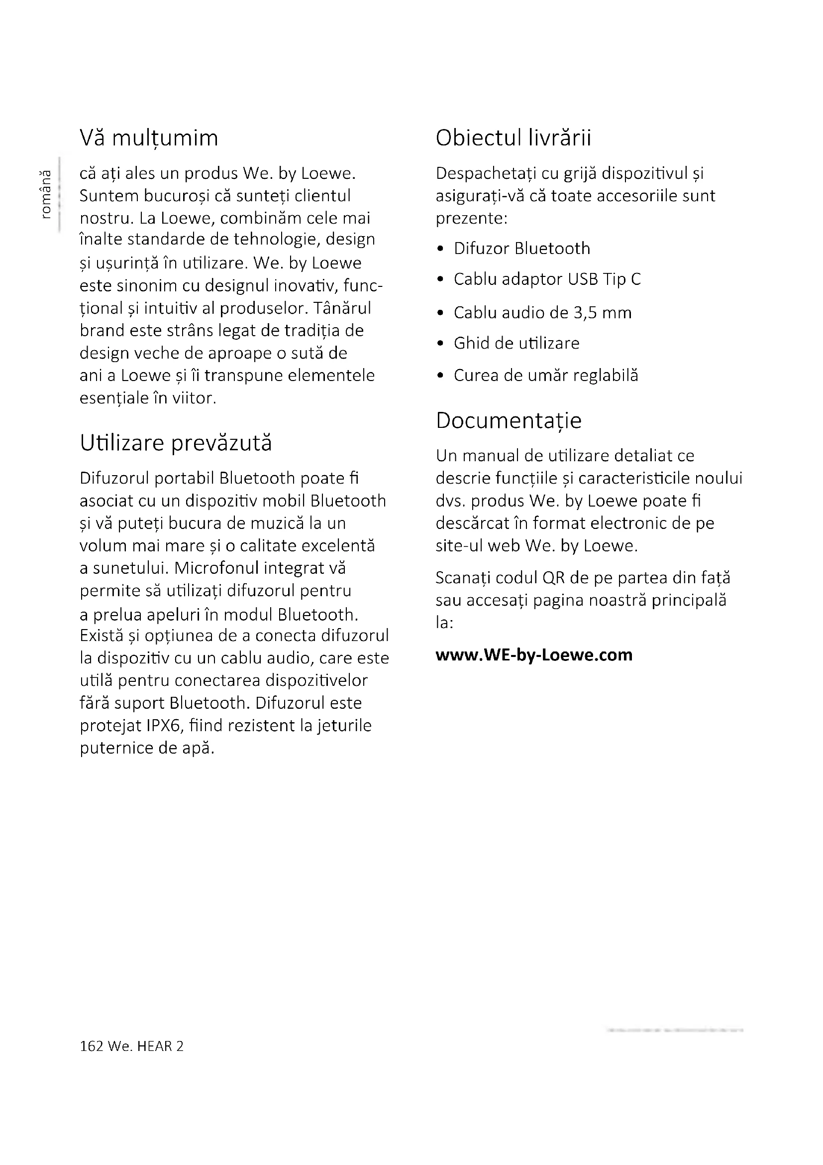 indicatorul luminos se va snge. 9 Protecție împotriva apei IPX6 Dispozivul are protecție IPX6, ceea ce înseamnă că jeturile puternice de apă nu vor avea efecte nocive asupra acestuia. Pentru ca această protecție să e ecientă, nu trebuie să conectate dis- pozive externe la difuzor prin cabluri (precum un telefon prin cablu audio sau un încărcător prin cablu USB), iar comparmentul conectorului trebuie să e închis ferm și etanș.168 We. HEAR 2 română Depanare În cazul unei defecțiuni a dispozivului, vă recomandăm să vericați lista de mai jos înainte de a apela la linia de asistență. Problemă Cauză posibilă Soluție/note Difuzorul nu poate pornit. Nivelul bateriei poate foarte scăzut. Încărcați difuzorul. Durata de încărcare a difuzoru- lui este prea mare. Încărcătorul dvs. USB furnizează un curent prea mic. Ulizați un încărcător USB de 5V/2A. Niciun sunet de la difuzor a. Volumul este prea mic sau este oprit. b. Niciun dispoziv nu este asociat cu difuzorul. a. Apăsați butonul (+) de mai multe ori sau creșteți volumul din dispoziv. b. Asociați și conectați dispozi- vul dvs. Bluetooth. Sunetul este distorsionat a. Dispozivul dvs. Blueto- oth este prea departe de difuzor b. Există interferențe wireless a. Mutați dispozivul mai aproape de difuzor b. Îndepărtați difuzorul de alte dispozive wireless. Date tehnice Tipul de dispozitiv We. by Loewe: We. HEAR 2 Număr de identificare: 60702x10 Tipul bateriei: Li-ion 7,4V / 4000mAh, integrată Curent de încărcare: 5V / 2A Durata de redare: 15 – 17h Durata de încărcare: 4 – 5h Unitate difuzor 2x 15 W RMS Protecție împotriva apei IPX6 Versiune Bluetooth V5.0 Putere/gamă de frecvențe Bluetooth: Putere maximă <10 mW la 2402 - 2480 MHz Protocoale Bluetooth: A2DP, AVRCP Dimensiuni dispozitiv (L x Î x A): 118 x 290 x 112 mm Greutate dispozitiv: 2 kg Temperatură ambiantă: 0°C – 40°C Umiditate relativă (fără condens): 20 – 70%We. HEAR 2 169 română170 We. HEAR 2