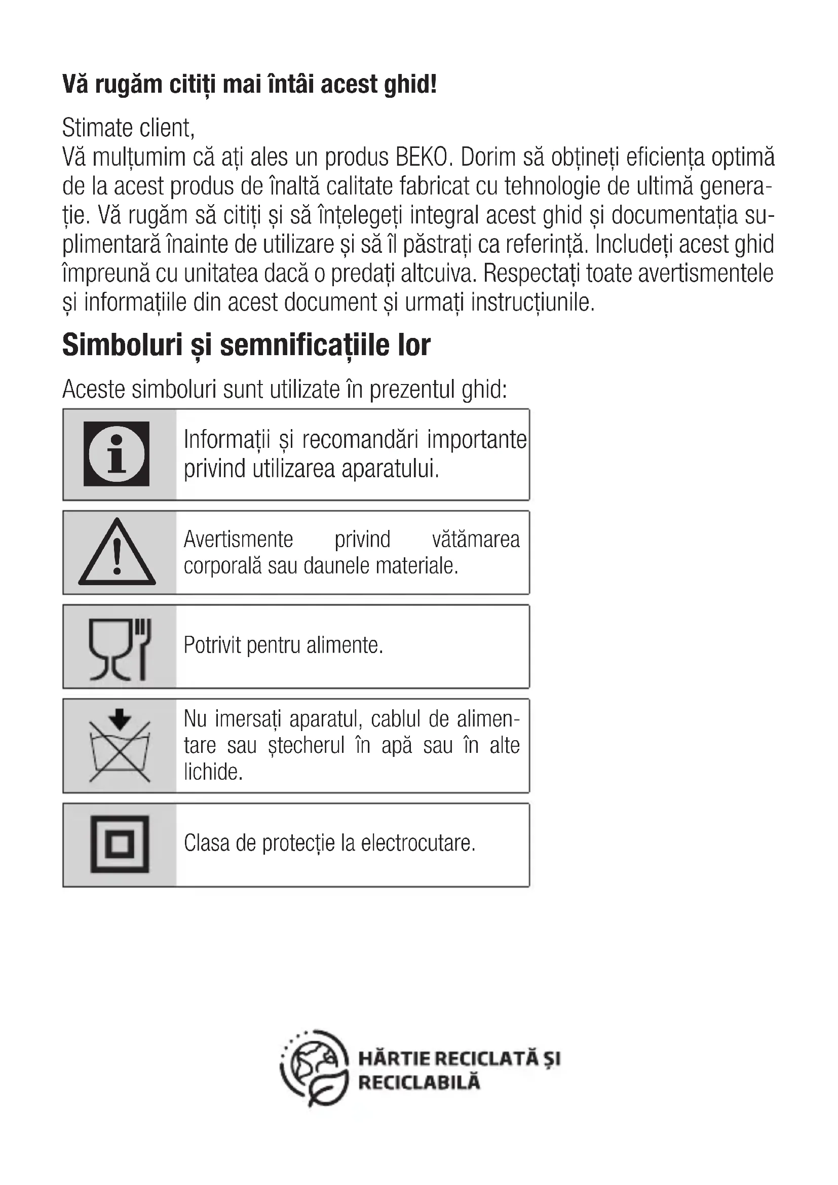- Ако апаратот падне, можеби нема да работи или ќе има трајни оштетувања. 4 Чистење и одржувањеVă rugăm citiți mai întâi acest ghid! Stimate client, Vă mulțumim că ați ales un produs BEKO. Dorim să obțineți eficiența optimă de la acest produs de înaltă calitate fabricat cu tehnologie de ultimă genera- ție. Vă rugăm să citiți și să înțelegeți integral acest ghid și documentația su- plimentară înainte de utilizare și să îl păstrați ca referință. Includeți acest ghid împreună cu unitatea dacă o predați altcuiva. Respectați toate avertismentele și informațiile din acest document și urmați instrucțiunile. Simboluri și semnificațiile lor Aceste simboluri sunt utilizate în prezentul ghid: