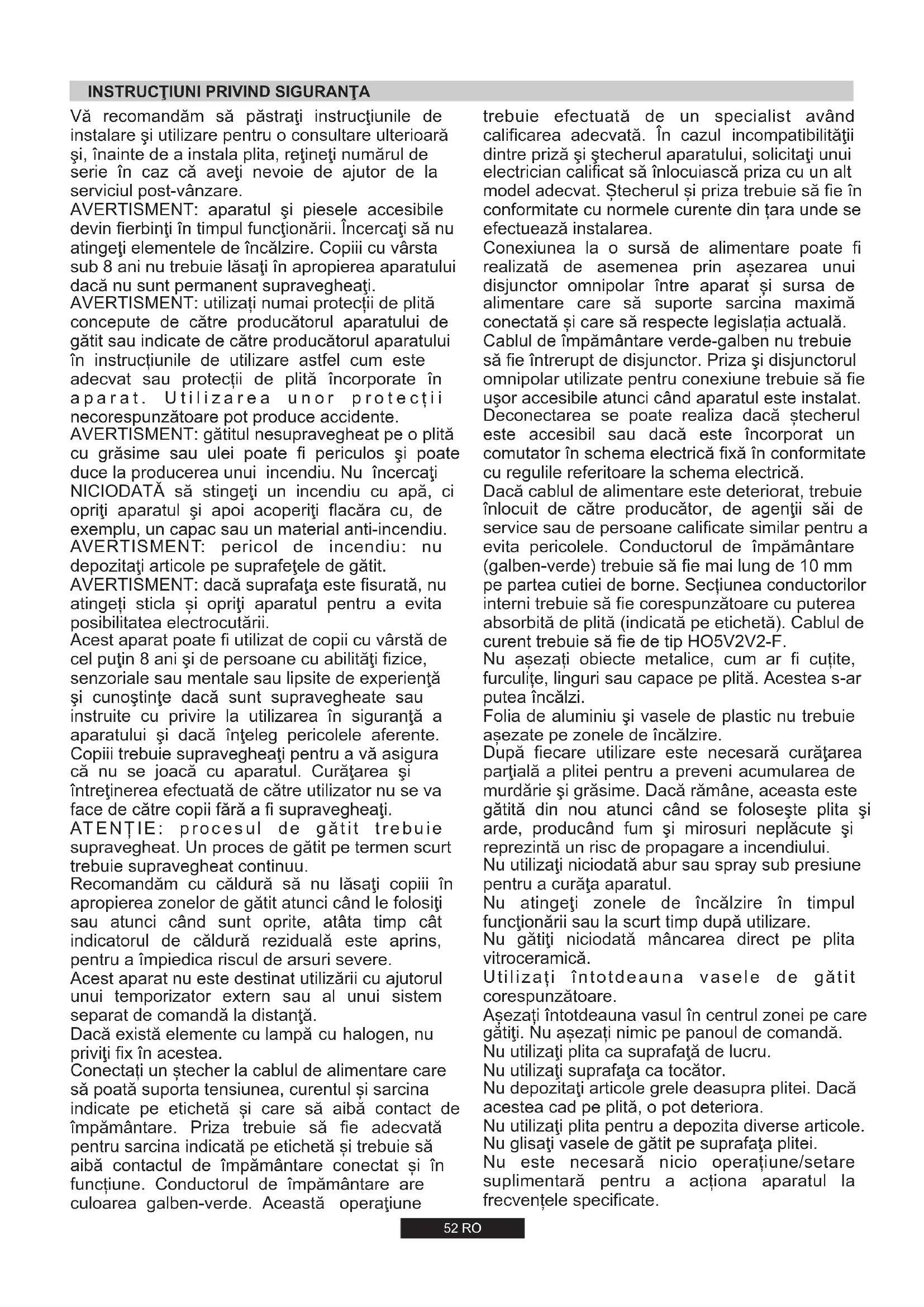 7,7 kW734 l/h560 g/h -52 RO AVERTISMENT: gătitul nesupravegheat pe o plită cu grăsime sau ulei poate fi periculos şi poate duce la producerea unui incendiu. Nu încercaţi NICIODATĂ să stingeţi un incendiu cu apă, ci opriţi aparatul şi apoi acoperiţi flacăra cu, de exemplu, un capac sau un material anti-incendiu. Acest aparat poate fi utilizat de copii cu vârstă de cel puţin 8 ani şi de persoane cu abilităţi fizice, senzoriale sau mentale sau lipsite de experienţă şi cunoştinţe dacă sunt supravegheate sau instruite cu privire la utilizarea în siguranţă a aparatului şi dacă înţeleg pericolele aferente. Copiii trebuie supravegheaţi pentru a vă asigura că nu se joacă cu aparatul. Curăţarea şi întreţinerea efectuată de către utilizator nu se va face de către copii fără a fi supravegheaţi. AVERTISMENT: utilizați numai protecții de plită concepute de către producătorul aparatului de gătit sau indicate de către producătorul aparatului în instrucțiunile de utilizare astfel cum este adecvat sau protecții de plită încorporate în a p a r a t . U t i l i z a r e a u n o r p r o t e c ț i i necorespunzătoare pot produce accidente. Acest aparat nu este destinat utilizării cu ajutorul unui temporizator extern sau al unui sistem separat de comandă la distanţă. Conectați un ștecher la cablul de alimentare care să poată suporta tensiunea, curentul și sarcina indicate pe etichetă și care să aibă contact de împământare. Priza trebuie să fie adecvată pentru sarcina indicată pe etichetă și trebuie să aibă contactul de împământare conectat și în funcțiune. Conductorul de împământare are culoarea galben-verde. Această operaţiune Dacă există elemente cu lampă cu halogen, nu priviţi fix în acestea. Vă recomandăm să păstraţi instrucţiunile de instalare şi utilizare pentru o consultare ulterioară şi, înainte de a instala plita, reţineţi numărul de serie în caz că aveţi nevoie de ajutor de la serviciul post-vânzare. AVERTISMENT: dacă suprafaţa este fisurată, nu atingeți sticla și opriţi aparatul pentru a evita posibilitatea electrocutării. AVERTISMENT: pericol de incendiu: nu depozitaţi articole pe suprafeţele de gătit. Recomandăm cu căldură să nu lăsaţi copiii în apropierea zonelor de gătit atunci când le folosiţi sau atunci când sunt oprite, atâta timp cât indicatorul de căldură reziduală este aprins, pentru a împiedica riscul de arsuri severe. ATENȚ IE : proc es ul de gătit trebuie supravegheat. Un proces de gătit pe termen scurt trebuie supravegheat continuu. AVERTISMENT: aparatul şi piesele accesibile devin fierbinţi în timpul funcţionării. Încercaţi să nu atingeţi elementele de încălzire. Copiii cu vârsta sub 8 ani nu trebuie lăsaţi în apropierea aparatului dacă nu sunt permanent supravegheaţi.