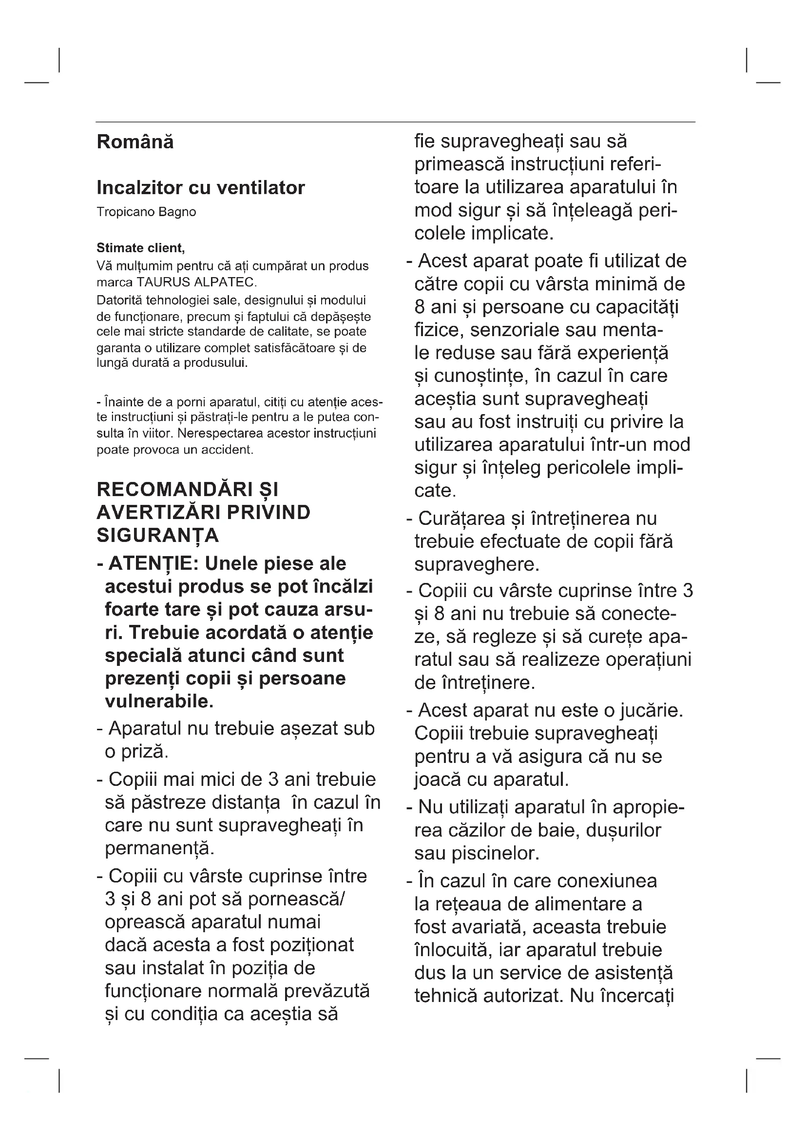 С возможностью дистанционного управления Нет С адаптивным управлением начала работы термостата Нет С ограничением рабочего времени Нет С датчиком температуры излучения Нет Контактная информация "ELECTRODOMÉSTICOS TAURUS, S.L. Avda. Barcelona S/N 25790 Oliana, Lleida, Spain”Română Incalzitor cu ventilator Tropicano Bagno Stimate client, Vă mulțumim pentru că ați cumpărat un produs marca TAURUS ALPATEC. Datorită tehnologiei sale, designului și modului de funcționare, precum și faptului că depășește cele mai stricte standarde de calitate, se poate garanta o utilizare complet satisfăcătoare și de lungă durată a produsului. - Înainte de a porni aparatul, citiți cu atenție aces- te instrucțiuni și păstrați-le pentru a le putea con- sulta în viitor. Nerespectarea acestor instrucțiuni poate provoca un accident.