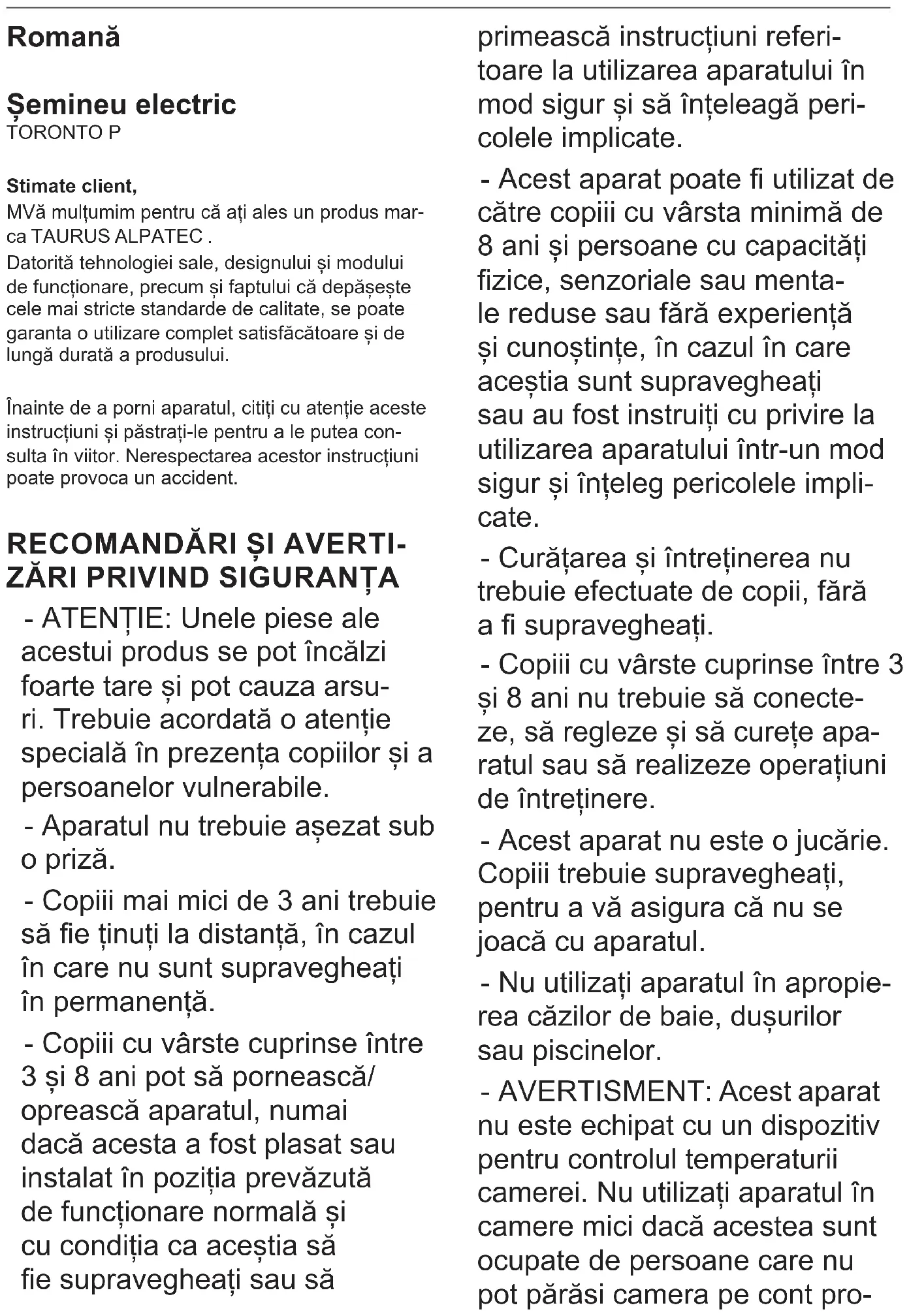 С возможностью дистанционного управления Нет С адаптивным управлением начала работы термостата Нет С ограничением рабочего времени Нет С датчиком температуры излучения Нет Контактная информация "ELECTRODOMÉSTICOS TAURUS, S.L. Avda. Barcelona S/N 25790 Oliana, Lleida, Spain”Romană Șemineu electric TORONTO P Stimate client, MVă mulțumim pentru că ați ales un produs mar- ca TAURUS ALPATEC . Datorită tehnologiei sale, designului și modului de funcționare, precum și faptului că depășește cele mai stricte standarde de calitate, se poate garanta o utilizare complet satisfăcătoare și de lungă durată a produsului. Înainte de a porni aparatul, citiți cu atenție aceste instrucțiuni și păstrați-le pentru a le putea con- sulta în viitor. Nerespectarea acestor instrucțiuni poate provoca un accident.