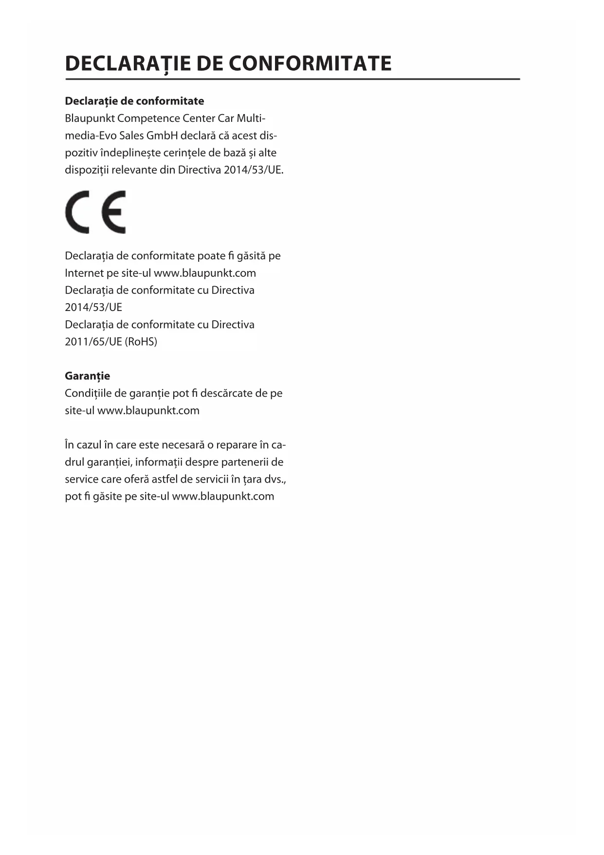 BPA 1121 BT Manual.indd 121 05.10.2021 16:15:38Declarație de conformitate Blaupunkt Competence Center Car Multi- media-Evo Sales GmbH declară că acest dis- pozitiv îndeplinește cerințele de bază și alte dispoziții relevante din Directiva 2014/53/UE. Declarația de conformitate poate găsită pe Internet pe site-ul www.blaupunkt.com Declarația de conformitate cu Directiva 2014/53/UE Declarația de conformitate cu Directiva 2011/65/UE (RoHS) Garanție Condițiile de garanție pot descărcate de pe site-ul www.blaupunkt.com În cazul în care este necesară o reparare în ca- drul garanției, informații despre partenerii de service care oferă astfel de servicii în țara dvs., pot găsite pe site-ul www.blaupunkt.com