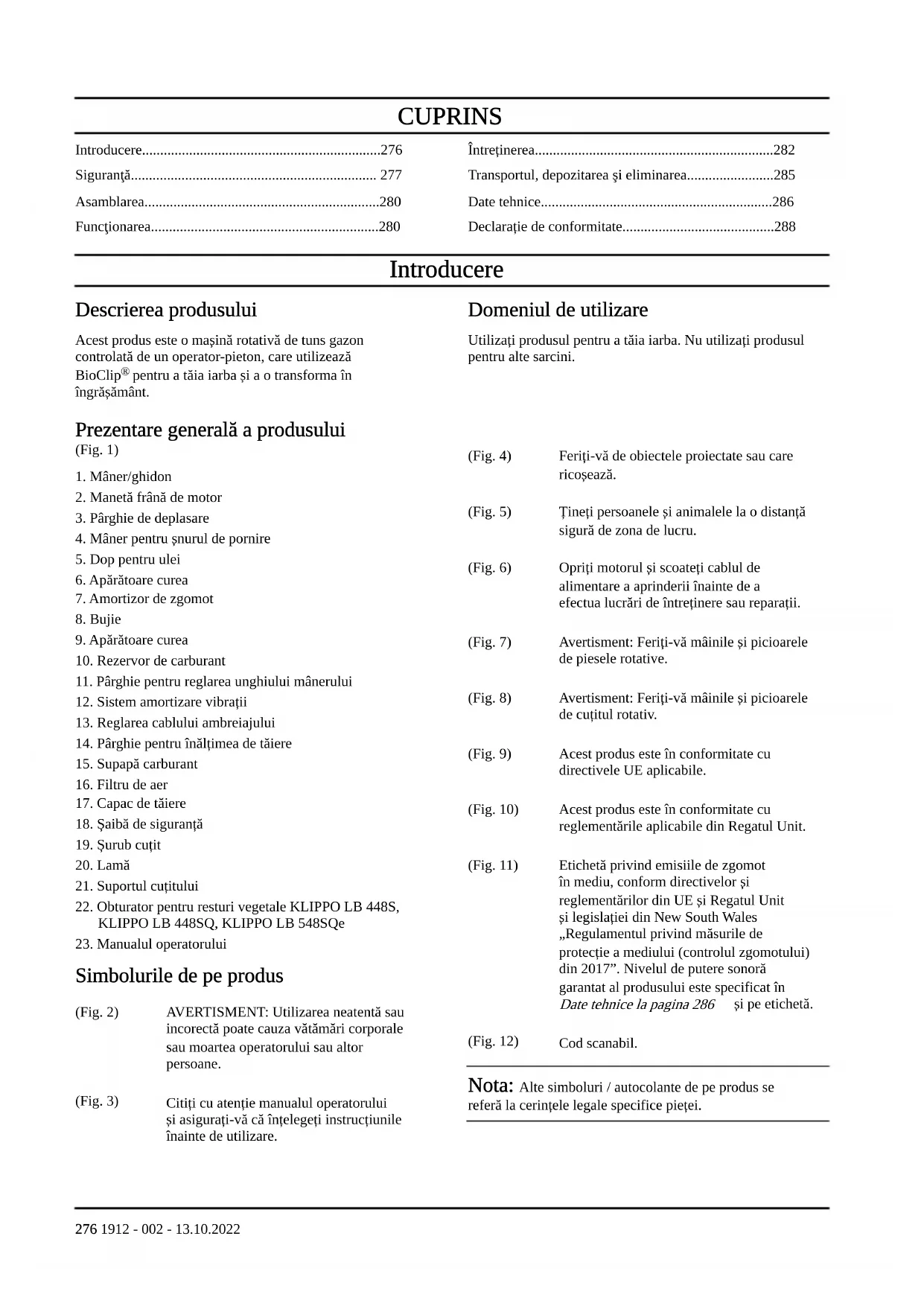 Simbolurile de pe produs (Fig. 2) AVERTISMENT: Utilizarea neatentă sau incorectă poate cauza vătămări corporale sau moartea operatorului sau altor persoane. (Fig. 3) Citiți cu atenție manualul operatorului și asigurați-vă că înțelegeți instrucțiunile înainte de utilizare. (Fig. 4) Feriți-vă de obiectele proiectate sau care ricoșează. (Fig. 5) Țineți persoanele și animalele la o distanță sigură de zona de lucru. (Fig. 6) Opriți motorul și scoateți cablul de alimentare a aprinderii înainte de a efectua lucrări de întreținere sau reparații. (Fig. 7) Avertisment: Feriți-vă mâinile și picioarele de piesele rotative. (Fig. 8) Avertisment: Feriți-vă mâinile și picioarele de cuțitul rotativ. (Fig. 9) Acest produs este în conformitate cu directivele UE aplicabile. (Fig. 10) Acest produs este în conformitate cu reglementările aplicabile din Regatul Unit. (Fig. 11) Etichetă privind emisiile de zgomot în mediu, conform directivelor și reglementărilor din UE și Regatul Unit și legislației din New South Wales „Regulamentul privind măsurile de protecție a mediului (controlul zgomotului) din 2017”. Nivelul de putere sonoră garantat al produsului este specificat în Date tehnice la pagina 286 și pe etichetă. (Fig. 12) Cod scanabil. Nota: Alte simboluri / autocolante de pe produs se referă la cerințele legale specifice pieței. 276 1912 - 002 - 13.10.2022Autocolant pe produs, numai pentru Australia și Noua Zeelandă (Fig. 13) Feriți-vă mâinile și picioarele de cuțitul rotativ. Emisiile de Euro V AVERTISMENT: În urma modificării neautorizate a motorului, este anulată aprobarea de tip UE pentru acest produs. Răspunderea pentru produs Conform prevederilor legislației privind răspunderea pentru produs, nu ne asumăm răspunderea pentru daunele cauzate de produsul nostru dacă: