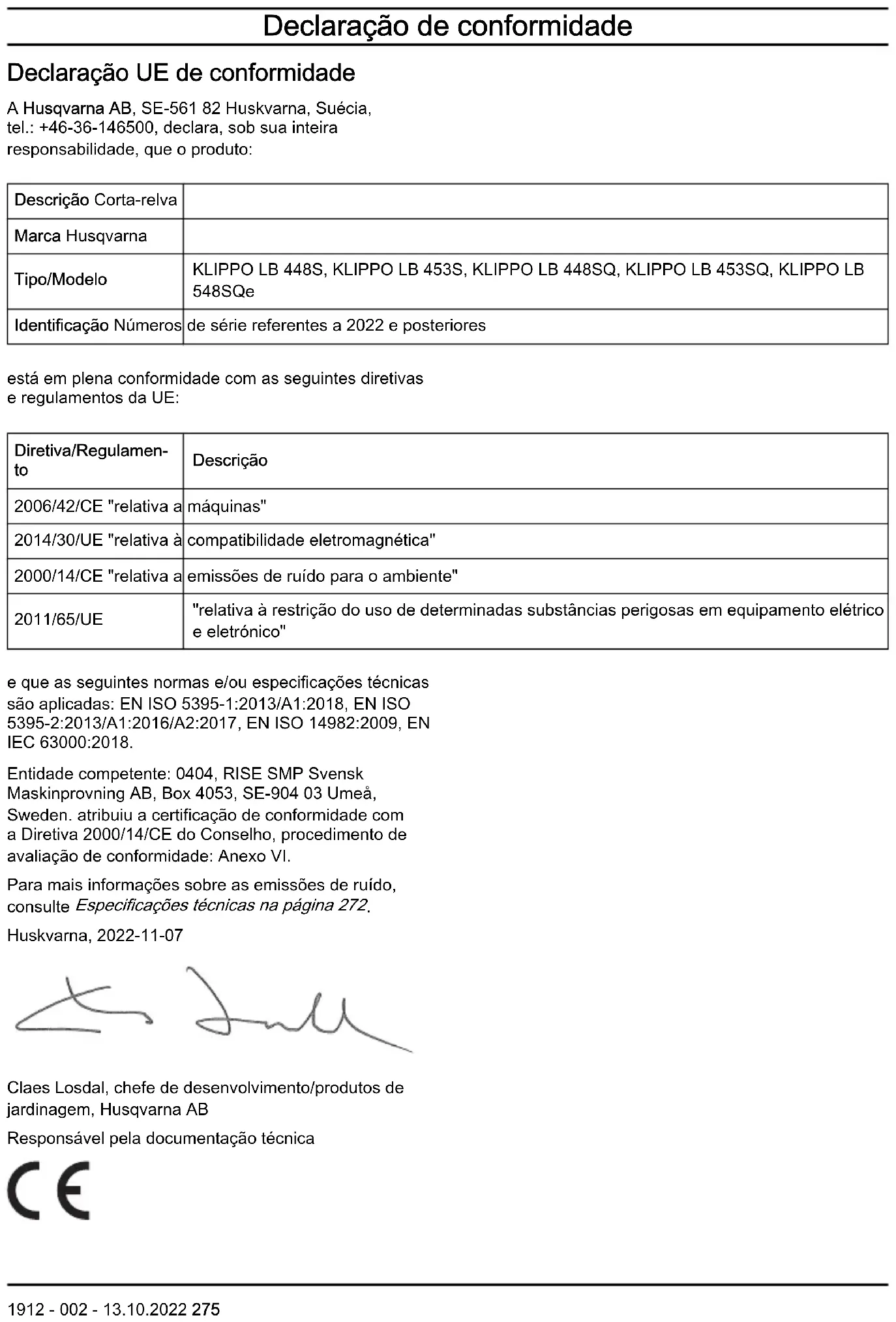 1912 - 002 - 13.10.2022 287Declarație de conformitate Declarație de conformitate UE Noi, Husqvarna AB, SE-561 82 Huskvarna, Suedia, tel.: +46-36-146500, declarăm pe propria răspundere, că produsul: Descriere Mașină de tuns iarbă Marcă Husqvarna Tip/Model KLIPPO LB 448S, KLIPPO LB 453S, KLIPPO LB 448SQ, KLIPPO LB 453SQ, KLIPPO LB 548SQe Identificare Numerele de serie începând cu 2022 respectă în totalitate următoarele directive și reglementări UE: Directivă/Regula- ment Descriere 2006/42/CE „privind echipamentele tehnice” 2014/30/UE „privind compatibilitatea electromagnetică” 2000/14/CE „privind emisiile de zgomot în mediul înconjurător” 2011/65/UE „privind restricțiile de utilizare a anumitor substanțe periculoase la echipamente electrice și electronice” și că au fost aplicate următoarele standarde și/sau specificații tehnice: EN ISO 5395-1:2013/A1:2018, EN ISO 5395-2:2013/A1:2016/A2:2017, EN ISO 14982:2009, EN IEC 63000:2018. Organismul notificat: 0404, RISE SMP Svensk Maskinprovning AB, Box 4053, SE-904 03 Umeå, Sweden. a certificat conformitatea cu directiva 2000/14/CE a consiliului, procedura de evaluare a conformității: Anexa VI. Pentru informații privind emisiile de zgomot, consultați Date tehnice la pagina 286