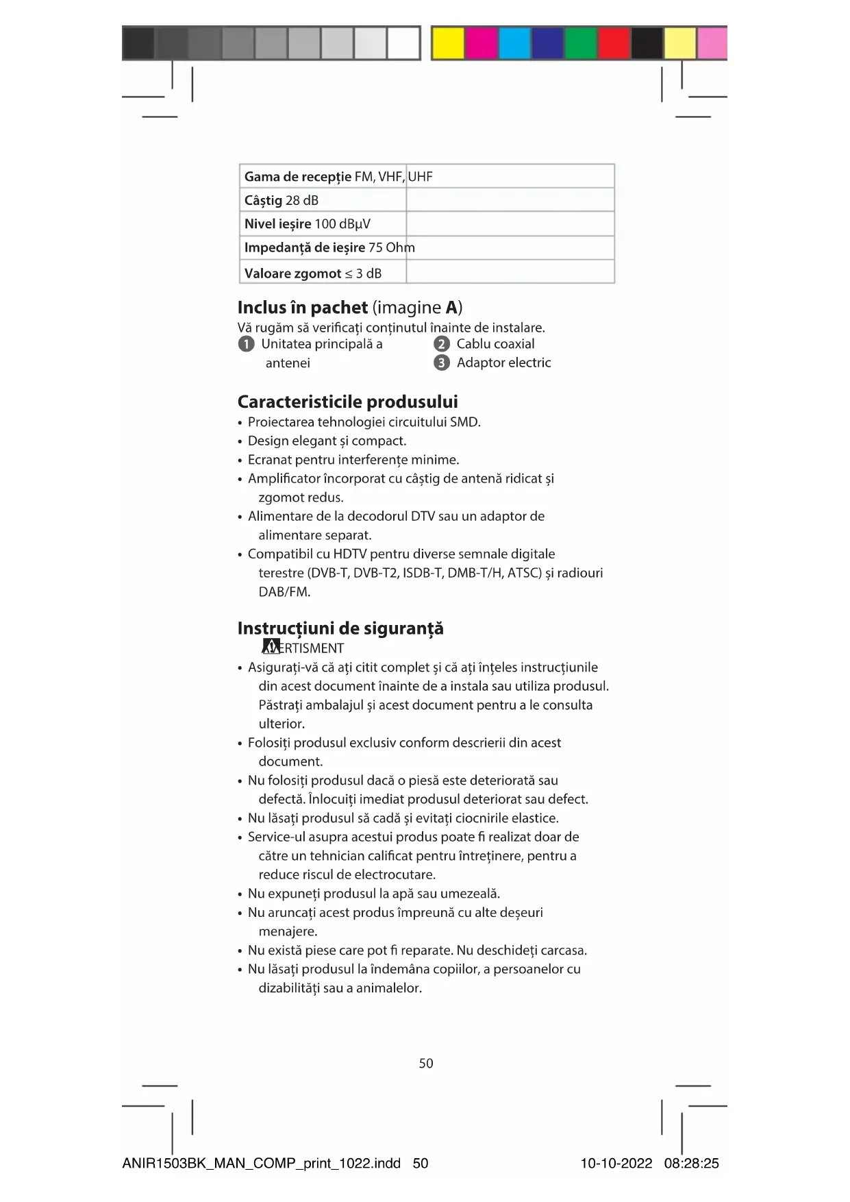 Ghid rapid de inițiere Antenă TV de interior ANIR1503BK Utilizare preconizată Acest produs este o antenă, care poate utilizată cu un televizor sau un decodor TV care acceptă alimentare prin cablu coaxial. Aceasta este o antenă proiectată special pentru recepționarea difuzării TV terestre digitale. Produsul este destinat exclusiv pentru utilizare în interior. Date tehnice Produs Antenă TV de interior Numărul articolului ANIR1503BK Energie electrică de intrare Adaptor AC/DC: 5.0 VDC; 200 mA Decodor DTV: 5.0 VDC; 40 mA Interval de frecvențe FM: 87,5 - 108,5 MHz VHF: 87.5 - 230 MHz UHF: 470 - 790 MHz ANIR1503BK_MAN_COMP_print_1022.indd 49ANIR1503BK_MAN_COMP_print_1022.indd 49 10-10-2022 08:28:2510-10-2022 08:28:2550 Gama de recepție FM, VHF, UHF Câștig 28 dB Nivel ieșire 100 dBµV Impedanță de ieșire 75 Ohm Valoare zgomot ≤ 3 dB Inclus în pachet (imagine A) Vă rugăm să vericați conținutul înainte de instalare. 1 Unitatea principală a antenei 2 Cablu coaxial 3 Adaptor electric Caracteristicile produsului