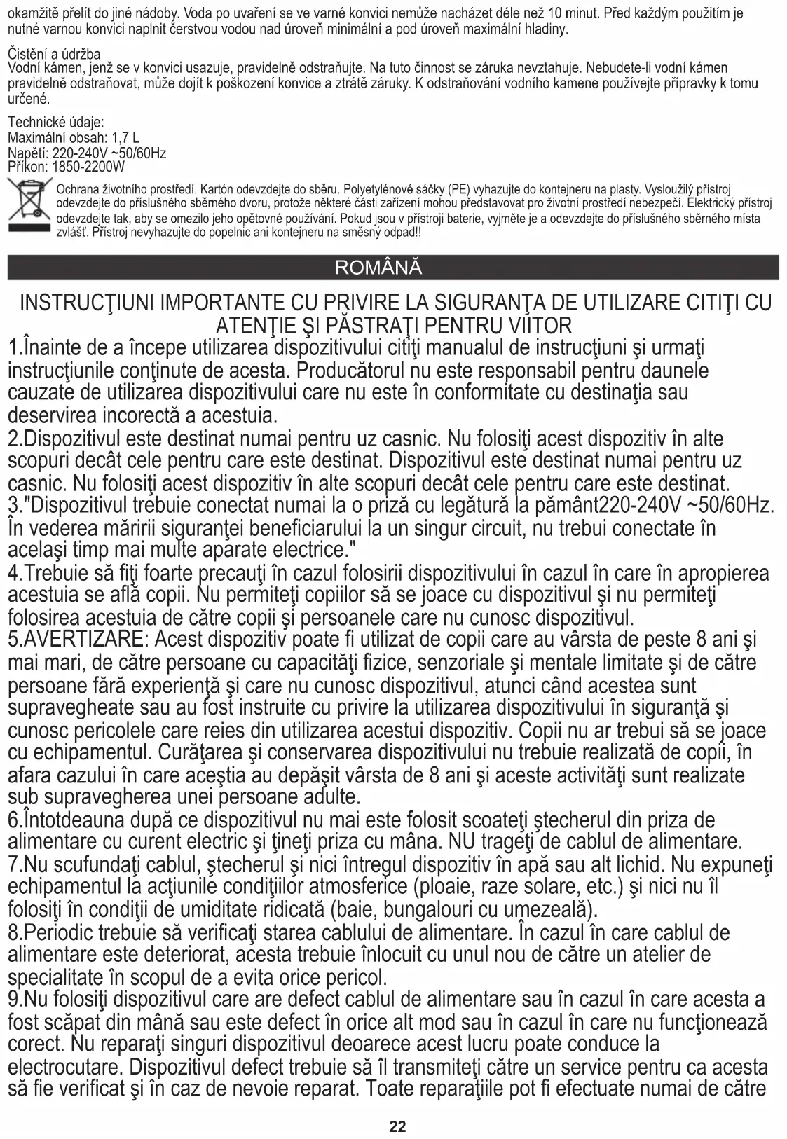 ROMÂNĂ 8.Periodic trebuie să verificaţi starea cablului de alimentare. În cazul în care cablul de alimentare este deteriorat, acesta trebuie înlocuit cu unul nou de către un atelier de specialitate în scopul de a evita orice pericol. 3."Dispozitivul trebuie conectat numai la o priză cu legătură la pământ220-240V ~50/60Hz. În vederea măririi siguranţei beneficiarului la un singur circuit, nu trebui conectate în acelaşi timp mai multe aparate electrice." 2.Dispozitivul este destinat numai pentru uz casnic. Nu folosiţi acest dispozitiv în alte scopuri decât cele pentru care este destinat. Dispozitivul este destinat numai pentru uz casnic. Nu folosiţi acest dispozitiv în alte scopuri decât cele pentru care este destinat. 6.Întotdeauna după ce dispozitivul nu mai este folosit scoateţi ştecherul din priza de alimentare cu curent electric şi ţineţi priza cu mâna. NU trageţi de cablul de alimentare. 5.AVERTIZARE: Acest dispozitiv poate fi utilizat de copii care au vârsta de peste 8 ani şi mai mari, de către persoane cu capacităţi fizice, senzoriale şi mentale limitate şi de către persoane fără experienţă şi care nu cunosc dispozitivul, atunci când acestea sunt supravegheate sau au fost instruite cu privire la utilizarea dispozitivului în siguranţă şi cunosc pericolele care reies din utilizarea acestui dispozitiv. Copii nu ar trebui să se joace cu echipamentul. Curăţarea şi conservarea dispozitivului nu trebuie realizată de copii, în afara cazului în care aceştia au depăşit vârsta de 8 ani şi aceste activităţi sunt realizate sub supravegherea unei persoane adulte. 1.Înainte de a începe utilizarea dispozitivului citiţi manualul de instrucţiuni şi urmaţi instrucţiunile conţinute de acesta. Producătorul nu este responsabil pentru daunele cauzate de utilizarea dispozitivului care nu este în conformitate cu destinaţia sau deservirea incorectă a acestuia. 4.Trebuie să fiţi foarte precauţi în cazul folosirii dispozitivului în cazul în care în apropierea acestuia se află copii. Nu permiteţi copiilor să se joace cu dispozitivul şi nu permiteţi folosirea acestuia de către copii şi persoanele care nu cunosc dispozitivul. INSTRUCŢIUNI IMPORTANTE CU PRIVIRE LA SIGURANŢA DE UTILIZARE CITIŢI CU ATENŢIE ŞI PĂSTRAŢI PENTRU VIITOR 7.Nu scufundaţi cablul, ştecherul şi nici întregul dispozitiv în apă sau alt lichid. Nu expuneţi echipamentul la acţiunile condiţiilor atmosferice (ploaie, raze solare, etc.) şi nici nu îl folosiţi în condiţii de umiditate ridicată (baie, bungalouri cu umezeală). 9.Nu folosiţi dispozitivul care are defect cablul de alimentare sau în cazul în care acesta a fost scăpat din mână sau este defect în orice alt mod sau în cazul în care nu funcţionează corect. Nu reparaţi singuri dispozitivul deoarece acest lucru poate conduce la electrocutare. Dispozitivul defect trebuie să îl transmiteţi către un service pentru ca acesta să fie verificat şi în caz de nevoie reparat. Toate reparaţiile pot fi efectuate numai de către okamžitě přelít do jiné nádoby. Voda po uvaření se ve varné konvici nemůže nacházet déle než 10 minut. Před každým použitím je nutné varnou konvici naplnit čerstvou vodou nad úroveň minimální a pod úroveň maximální hladiny. Čistění a údržba Vodní kámen, jenž se v konvici usazuje, pravidelně odstraňujte. Na tuto činnost se záruka nevztahuje. Nebudete-li vodní kámen pravidelně odstraňovat, může dojít k poškození konvice a ztrátě záruky. K odstraňování vodního kamene používejte přípravky k tomu určené. Technické údaje: Příkon: 1850-2200W Maximální obsah: 1,7 L Napětí: 220-240V ~50/60Hz Ochrana životního prostředí. Kartón odevzdejte do sběru. Polyetylénové sáčky (PE) vyhazujte do kontejneru na plasty. Vysloužilý přístroj odevzdejte do příslušného sběrného dvoru, protože některé části zařízení mohou představovat pro životní prostředí nebezpečí. Elektrický přístroj odevzdejte tak, aby se omezilo jeho opětovné používání. Pokud jsou v přístroji baterie, vyjměte je a odevzdejte do příslušného sběrného místa zvlášť. Přístroj nevyhazujte do popelnic ani kontejneru na směsný odpad!!23 14.Pentru a asigura o protecţie suplimentară, se recomandă instalarea pe circuitul electric a unui dispozitiv cu curent diferenţial (RCD) cu curent alternativ diferenţial care nu va depăşi 30 mA. În acest sens trebuie să vă adresaţi unui electrician specialist.