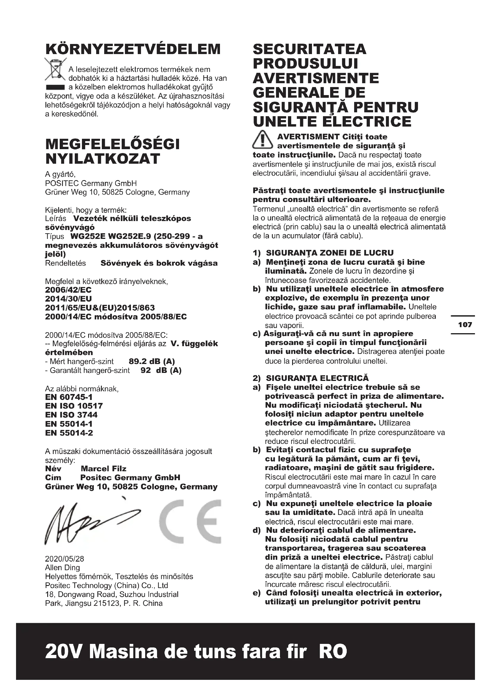 CONFORMITATE Subsemnaţii, Positec Germany GmbH Grüner Weg 10, 50825 Cologne, Germany Declarăm că produsul, Descriere Foarfece telescopic de tăiat gard viu Tie WG252E WG252E.9 (250-299- denumirea echipamentului, reprezentând Maşină de tuns gard viu fără cordon) Funcţii: Tunderea gardului viu şi a tuşurilor Respectă următoarele Directive: 2006/42/EC 2014/30/EU 2011/65/EU&(EU)2015/863 2000/14/EC amendată de 2005/88/EC 2000/14/EC amendată de 2005/88/EC: - Procedură de evaluare a conformităţii conformă cu Anexa V - Nivel de putere sonoră măsurat 89.2 dB(A) -Nivel declarat de putere sonoră garantată 92 dB(A) Nivel declarat de putere sonoră garantată , EN 60745-1, EN ISO 10517 EN ISO 3744 EN 55014-1 EN 55014-2 Persoana responsabilă pentru elaborarea şei tehnice, Nume Marcel Filz Adresă Positec Germany GmbH, Grüner Weg 10, 50825 Cologne, Germany 2020/05/28 Allen Ding Adjunct Inginer şef, Testare si certicare Positec Technology (China) Co., Ltd 18, Dongwang Road, Suzhou Industrial Park, Jiangsu 215123, P. R. China