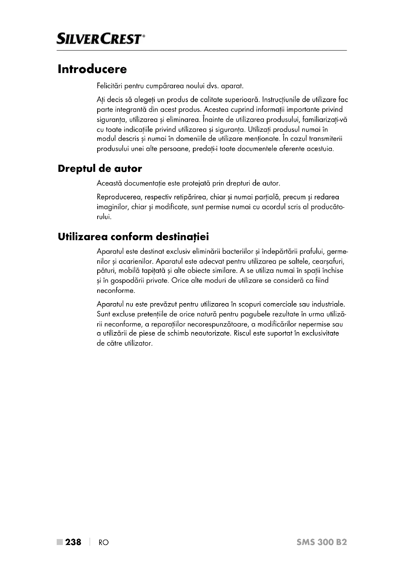 RO SMS 300 B2 Introducere Felicitări pentru cumpărarea noului dvs. aparat. Aţi decis să alegeţi un produs de calitate superioară. Instrucţiunile de utilizare fac parte integrantă din acest produs. Acestea cuprind informaţii importante privind siguranţa, utilizarea și eliminarea. Înainte de utilizarea produsului, familiarizaţi-vă cu toate indicaţiile privind utilizarea și siguranţa. Utilizaţi produsul numai în modul descris și numai în domeniile de utilizare menţionate. În cazul transmiterii produsului unei alte persoane, predaţi-i toate documentele aferente acestuia. Dreptul de autor Această documentaţie este protejată prin drepturi de autor. Reproducerea, respectiv retipărirea, chiar și numai parţială, precum și redarea imaginilor, chiar și modificate, sunt permise numai cu acordul scris al producăto- rului. Utilizarea conform destinaţiei Aparatul este destinat exclusiv eliminării bacteriilor și îndepărtării prafului, germe- nilor și acarienilor. Aparatul este adecvat pentru utilizarea pe saltele, cearșafuri, pături, mobilă tapiţată și alte obiecte similare. A se utiliza numai în spaţii închise și în gospodării private. Orice alte moduri de utilizare se consideră ca fiind neconforme. Aparatul nu este prevăzut pentru utilizarea în scopuri comerciale sau industriale. Sunt excluse pretenţiile de orice natură pentru pagubele rezultate în urma utiliză- rii neconforme, a reparaţiilor necorespunzătoare, a modificărilor nepermise sau a utilizării de piese de schimb neautorizate. Riscul este suportat în exclusivitate de către utilizator.RO