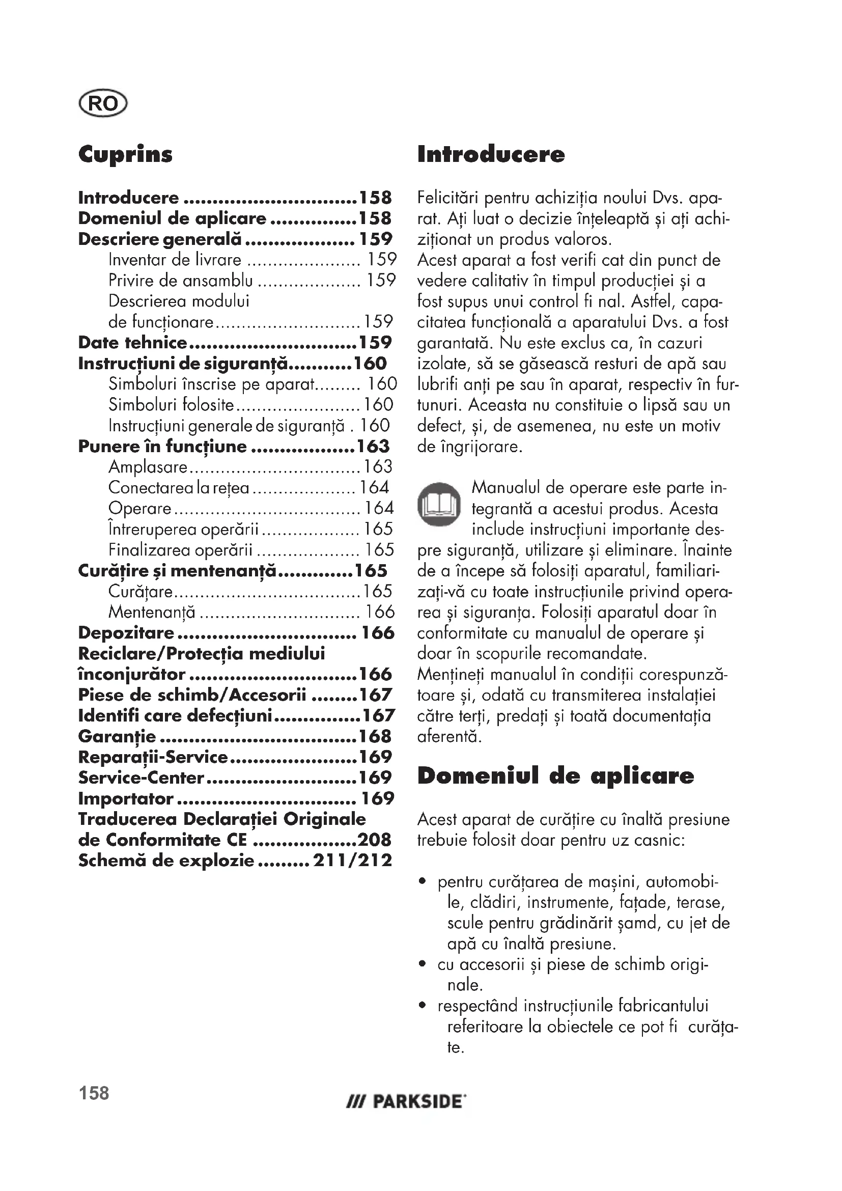 - respectând instrucţiunile fabricantului referitoare la obiectele ce pot curăţa- te. Cuprins Introducere ..............................158 Domeniul de aplicare ...............158 Descriere generală ................... 159 Inventar de livrare ...................... 159 Privire de ansamblu .................... 159 Descrierea modului de funcţionare ............................ 159 Date tehnice .............................159 Instrucţiuni de siguranţă...........160 Simboluri înscrise pe aparat......... 160 Simboluri folosite ........................ 160 Instrucţiuni generale de siguranţă . 160 Punere în funcţiune ..................163 Amplasare ................................. 163 Conectarea la reţea .................... 164 Operare .................................... 164 Întreruperea operării ................... 165 Finalizarea operării .................... 165 Curăţire şi mentenanţă .............165 Curăţare .................................... 165 Mentenanţă ............................... 166 Depozitare ............................... 166 Reciclare/Protecţia mediului înconjurător .............................166 Piese de schimb/Accesorii ........167 Identi care defecţiuni ...............167 Garanţie ..................................168 Reparaţii-Service ......................169 Service-Center ..........................169 Importator ............................... 169 Traducerea Declaraţiei Originale de Conformitate CE ..................208 Schemă de explozie ......... 211/212RO