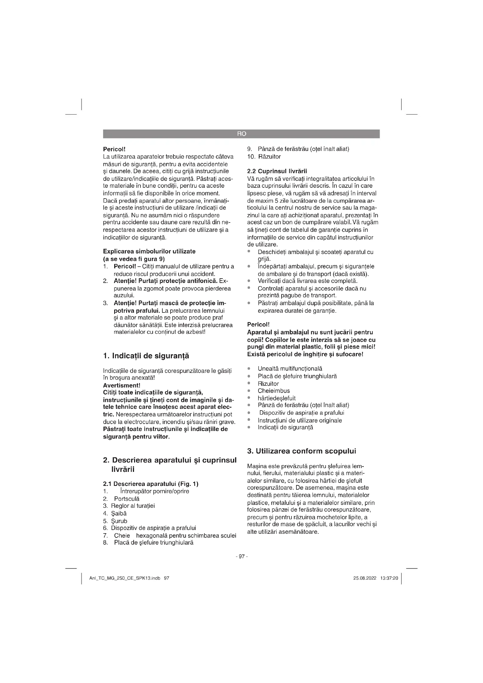 Maşina este prevăzută pentru şlefuirea lem- nului, fi erului, materialului plastic şi a materi- alelor similare, cu folosirea hârtiei de şlefuit corespunzătoare. De asemenea, maşina este destinată pentru tăierea lemnului, materialelor plastice, metalului şi a materialelor similare, prin folosirea pânzei de ferăstrău corespunzătoare, precum şi pentru răzuirea mochetelor lipite, a resturilor de mase de şpăcluit, a lacurilor vechi şi alte utilizări asemănătoare. Anl_TC_MG_250_CE_SPK13.indb 97Anl_TC_MG_250_CE_SPK13.indb 97 25.08.2022 13:37:2025.08.2022 13:37:20RO