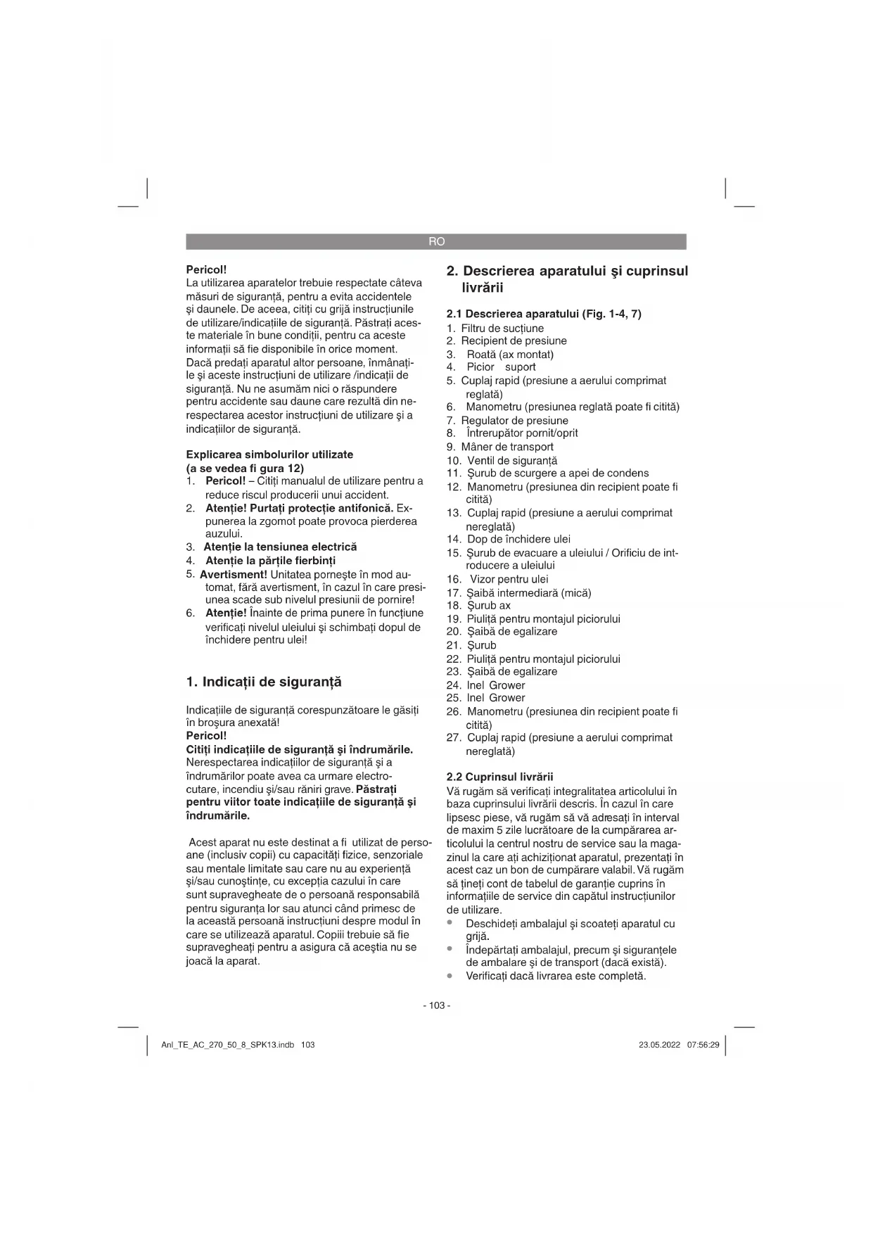 Este necesară utilizarea de separatoare, dis- pozitive de prindere şi posibilităţi de scurgere, care sunt necesare la prelucrarea lichidelor produse de compresor înainte de punerea în Anl_TE_AC_270_50_8_SPK13.indb 104Anl_TE_AC_270_50_8_SPK13.indb 104 23.05.2022 07:56:3023.05.2022 07:56:30RO