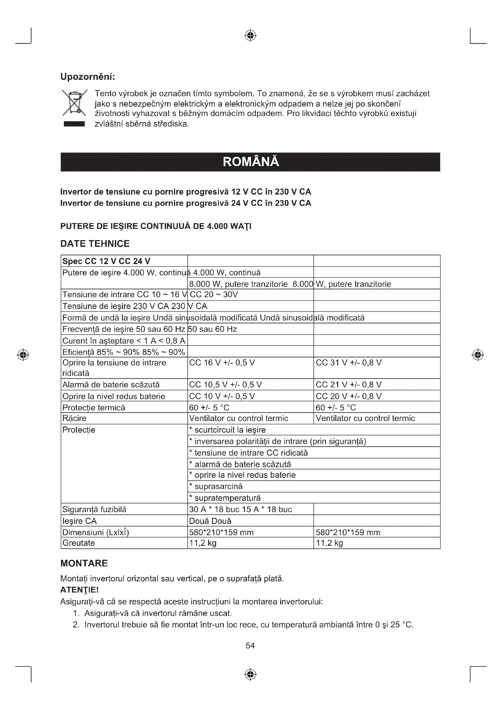 luminos de SUPRASARCINĂ nu luminează a. Scurtcircuit sau eroare de cablare Vericaţi cablurile CA de scurtcircuite sau polaritate incorectă b. Sarcină electrică foarte ridicată Eliminaţi sau reduceţi sarcina Dacă invertorul nu funcţionează nici după măsurile de remediere a problemelor de mai sus, returnaţi-l sau solicitaţi vericarea şi înlocuirea de către un electrician calicat. Nu desfaceţi carcasa şi nu tăiaţi cablul. ATENŢIE: Nu utilizaţi invertorul cu următoarele aparate reîncărcabile: Două tipuri anume de încărcătoare pentru bateriile mici din nichel-cadmiu pot deteriorate dacă sunt conectate la invertor: a. Aparatele alimentate de baterii mici, cum ar lanternele, aparatele de ras electrice şi felinarele care pot cuplate direct la priza CA pentru reîncărcare. b. Anumite încărcătoare de baterie pentru blocuri de baterii utilizate la sculele electrice portabile. Aceste încărcătoare vor avea o etichetă de avertizare care indică prezenţa de tensiuni periculoase la bornele bateriei. Această problemă nu survine la majoritatea echipamentelor alimentate prin baterii. Majoritatea acestor echipamente utilizează un încărcător sau un transformator separat care este conectat la o priză CA şi produce o tensiune de ieşire mai scăzută. Dacă eticheta de pe adaptorul sau încărcătorul CA indică faptul că acesta produce o tensiune de ieşire CA sau CC scăzută (sub 30 volţi), invertorul va alimenta adaptorul sau încărcătorul în condiţii de siguranţă, fără inconveniente. UTILIZAŢI CABLURILEŞI BATERIA CORECTE! În majoritatea exploatărilor invertorului de 4.000 W, se recomandă utilizarea unei sau mai multor baterii cu ciclu de descărcare profund în paralel. O capacitate mai ridicată este de preferat, deoarece astfel va exista o rezervă care va împiedica bateria să se descarce prea mult. Amperaj de intrare recomandat: 12 V -> 366 A 24 V -> 183 A Cablu CC recomandat: 12 V -> #38x2 24 V -> #38x1 Măsuri de siguranţă: Pentru a se reduce pericolul de electrocutare, acest produs va desfăcut NUMAI de către un tehnician avizat, când este necesară depanarea. Deconectaţi produsul de la priza de reţea sau alte echipamente în cazul apariţiei unei probleme. Nu expuneţi produsul apei sau umezelii. Întreţinere: Curăţarea trebuie făcută cu o cârpă uscată. Nu folosiţi solvenţi sau agenţi de curăţare abrazivi.