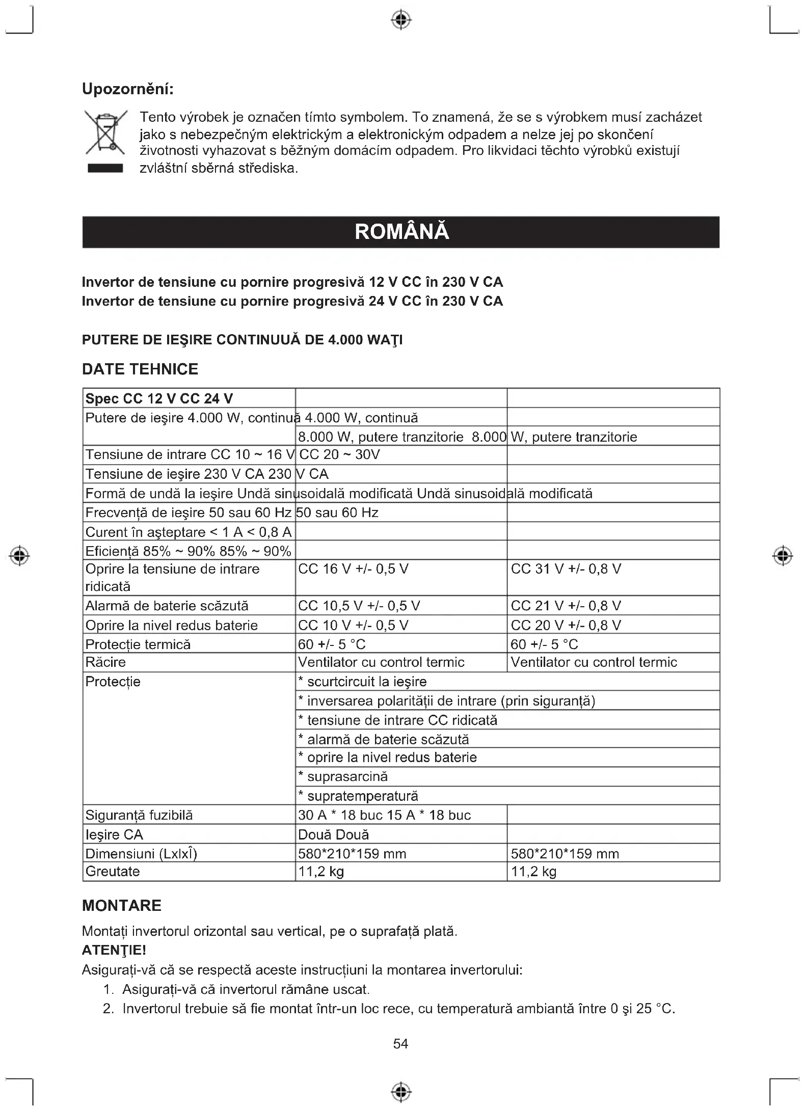 - supratemperatură Siguranţă fuzibilă 30 A * 18 buc 15 A * 18 buc Ieşire CA Două Două Dimensiuni (LxlxÎ) 580*210*159 mm 580*210*159 mm Greutate 11,2 kg 11,2 kg MONTARE Montaţi invertorul orizontal sau vertical, pe o suprafaţă plată. ATENŢIE! Asiguraţi-vă că se respectă aceste instrucţiuni la montarea invertorului: