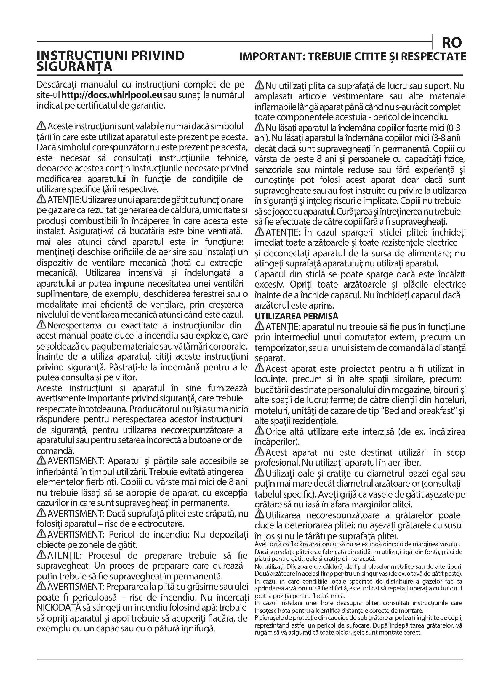 - a telefonszámát. Ha bármilyen javításra van szükség, kérjük, hogy a hivatalos vevőszolgálathoz forduljon (annak biztosítása érdekében, hogy eredeti alkatrészeket használjanak, és a javításokat megfelelően végezzék el).Descărcați manualul cu instrucţiuni complet de pe site-ul http://docs.whirlpool.eu sau sunați la numărul indicat pe certicatul de garanţie. Aceste instrucţiuni sunt valabile numai dacă simbolul ţării în care este utilizat aparatul este prezent pe acesta. Dacă simbolul corespunzător nu este prezent pe acesta, este necesar să consultați instrucțiunile tehnice, deoarece acestea conţin instrucțiunile necesare privind modicarea aparatului în funcţie de condițiile de utilizare specice ţării respective. ATENŢIE: Utilizarea unui aparat de gătit cu funcţionare pe gaz are ca rezultat generarea de căldură, umiditate și produși combustibili în încăperea în care acesta este instalat. Asigurați-vă că bucătăria este bine ventilată, mai ales atunci când aparatul este în funcțiune: mențineți deschise oriciile de aerisire sau instalați un dispozitiv de ventilare mecanică (hotă cu extracție mecanică). Utilizarea intensivă și îndelungată a aparatului ar putea impune necesitatea unei ventilări suplimentare, de exemplu, deschiderea ferestrei sau o modalitate mai ecientă de ventilare, prin creșterea nivelului de ventilarea mecanică atunci când este cazul. Nerespectarea cu exactitate a instrucțiunilor din acest manual poate duce la incendiu sau explozie, care se soldează cu pagube materiale sau vătămări corporale. Înainte de a utiliza aparatul, citiți aceste instrucţiuni privind siguranţă. Păstrați-le la îndemână pentru a le putea consulta și pe viitor. Aceste instrucţiuni și aparatul în sine furnizează avertismente importante privind siguranţă, care trebuie respectate întotdeauna. Producătorul nu își asumă nicio răspundere pentru nerespectarea acestor instrucţiuni de siguranţă, pentru utilizarea necorespunzătoare a aparatului sau pentru setarea incorectă a butoanelor de comandă. AVERTISMENT: Aparatul și părțile sale accesibile se înerbântă în timpul utilizării. Trebuie evitată atingerea elementelor erbinți. Copiii cu vârste mai mici de 8ani nu trebuie lăsați să se apropie de aparat, cu excepţia cazurilor în care sunt supravegheați în permanenta. AVERTISMENT: Dacă suprafaţă plitei este crăpată, nu folosiți aparatul – risc de electrocutare. AVERTISMENT: Pericol de incendiu: Nu depozitați obiecte pe zonele de gătit. ATENŢIE: Procesul de preparare trebuie să e supravegheat. Un proces de preparare care durează puţin trebuie să e supravegheat în permanentă. AVERTISMENT: Prepararea la plită cu grăsime sau ulei poate periculoasă - risc de incendiu. Nu încercați NICIODATĂ să stingeți un incendiu folosind apă: trebuie să opriți aparatul și apoi trebuie să acoperiți acăra, de exemplu cu un capac sau cu o pătură ignifugă. Nu utilizați plita ca suprafaţă de lucru sau suport. Nu amplasați articole vestimentare sau alte materiale inamabile lângă aparat până când nu s-au răcit complet toate componentele acestuia- pericol de incendiu. Nu lăsați aparatul la îndemâna copiilor foarte mici (0-3 ani). Nu lăsați aparatul la îndemâna copiilor mici (3-8ani) decât dacă sunt supravegheați în permanentă. Copiii cu vârsta de peste 8 ani și persoanele cu capacităţi zice, senzoriale sau mintale reduse sau fără experienţă și cunoștinţe pot folosi acest aparat doar dacă sunt supravegheate sau au fost instruite cu privire la utilizarea în siguranţă și înțeleg riscurile implicate. Copiii nu trebuie să se joace cu aparatul. Curățarea și întreținerea nu trebuie să e efectuate de către copii fără a supravegheați. ATENŢIE: În cazul spargerii sticlei plitei: închideți imediat toate arzătoarele și toate rezistențele electrice și deconectați aparatul de la sursa de alimentare; nu atingeți suprafaţă aparatului; nu utilizați aparatul. Capacul din sticlă se poate sparge dacă este încălzit excesiv. Opriți toate arzătoarele și plăcile electrice înainte de a închide capacul. Nu închideți capacul dacă arzătorul este aprins. UTILIZAREA PERMISĂ ATENŢIE: aparatul nu trebuie să e pus în funcțiune prin intermediul unui comutator extern, precum un temporizator, sau al unui sistem de comandă la distanţă separat. Acest aparat este proiectat pentru a utilizat în locuințe, precum și în alte spații similare, precum: bucătării destinate personalului din magazine, birouri și alte spații de lucru; ferme; de către clienţii din hoteluri, moteluri, unităţi de cazare de tip “Bed and breakfast” și alte spații rezidențiale. Orice altă utilizare este interzisă (de ex. încălzirea încăperilor). Acest aparat nu este destinat utilizării în scop profesional. Nu utilizați aparatul în aer liber. Utilizați oale și cratițe cu diametrul bazei egal sau puţin mai mare decât diametrul arzătoarelor (consultați tabelul specic). Aveți grijă ca vasele de gătit așezate pe grătare să nu iasă în afara marginilor plitei. Utilizarea necorespunzătoare a grătarelor poate duce la deteriorarea plitei: nu așezați grătarele cu susul în jos și nu le târâți pe suprafaţă plitei. Aveți grijă ca acăra arzătorului să nu se extindă dincolo de marginea vasului.Dacă suprafața plitei este fabricată din sticlă, nu utilizați tigăi din fontă, plăci de piatră pentru gătit, oale și cratițe din teracotă.Nu utilizați: Difuzoare de căldură, de tipul plaselor metalice sau de alte tipuri. Două arzătoare în același timp pentru un singur vas (de ex. o tavă de gătit pește). În cazul în care condițiile locale specice de distribuire a gazelor fac ca aprinderea arzătorului să e dicilă, este indicat să repetați operația cu butonul rotit la poziția pentru acără mică.În