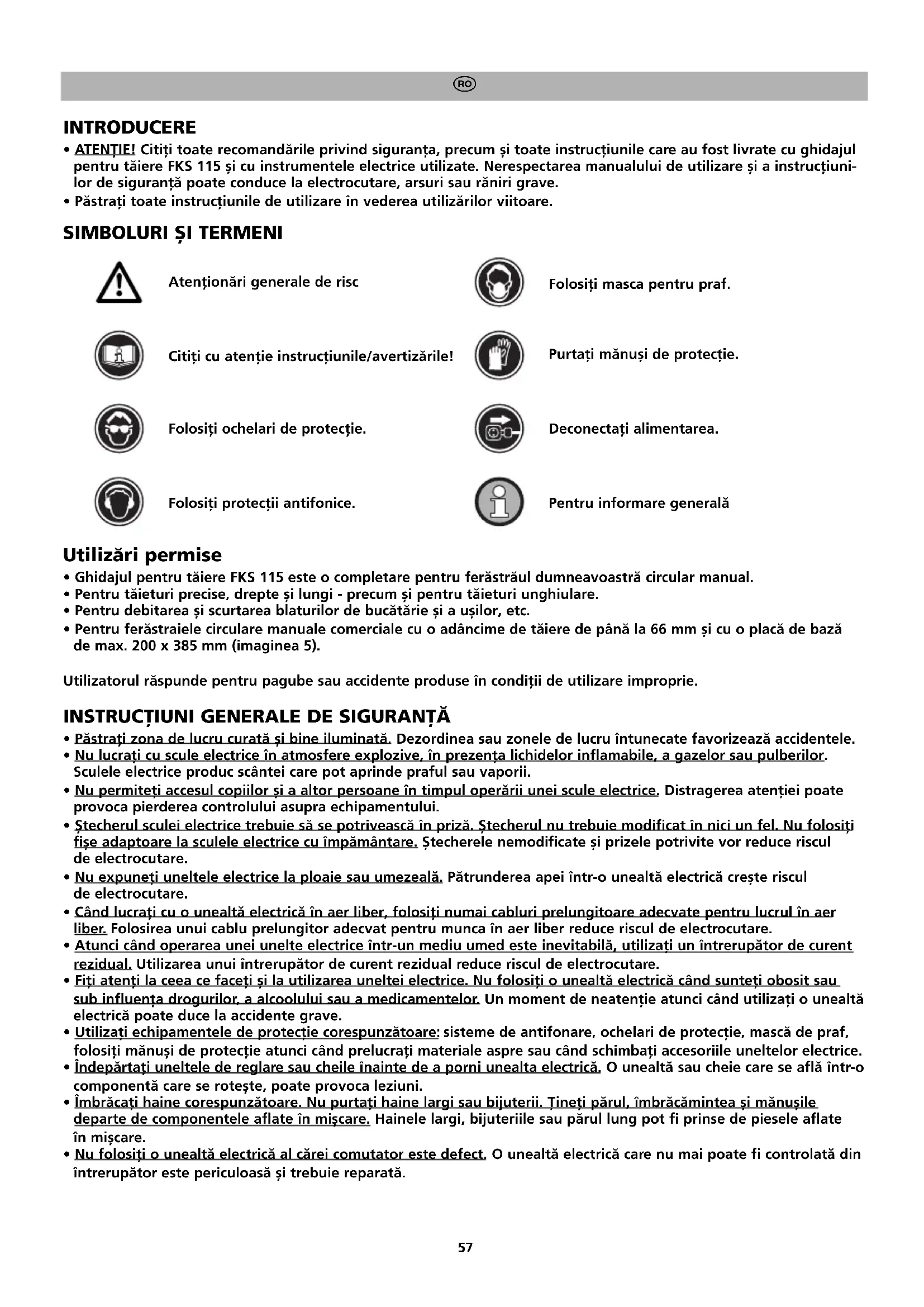 - ATENŢIE! Citiți toate recomandările privind siguranța, precum și toate instrucțiunile care au fost livrate cu ghidajul pentru tăiere FKS 115 și cu instrumentele electrice utilizate. Nerespectarea manualului de utilizare și a instrucţiuni- lor de siguranţă poate conduce la electrocutare, arsuri sau răniri grave.