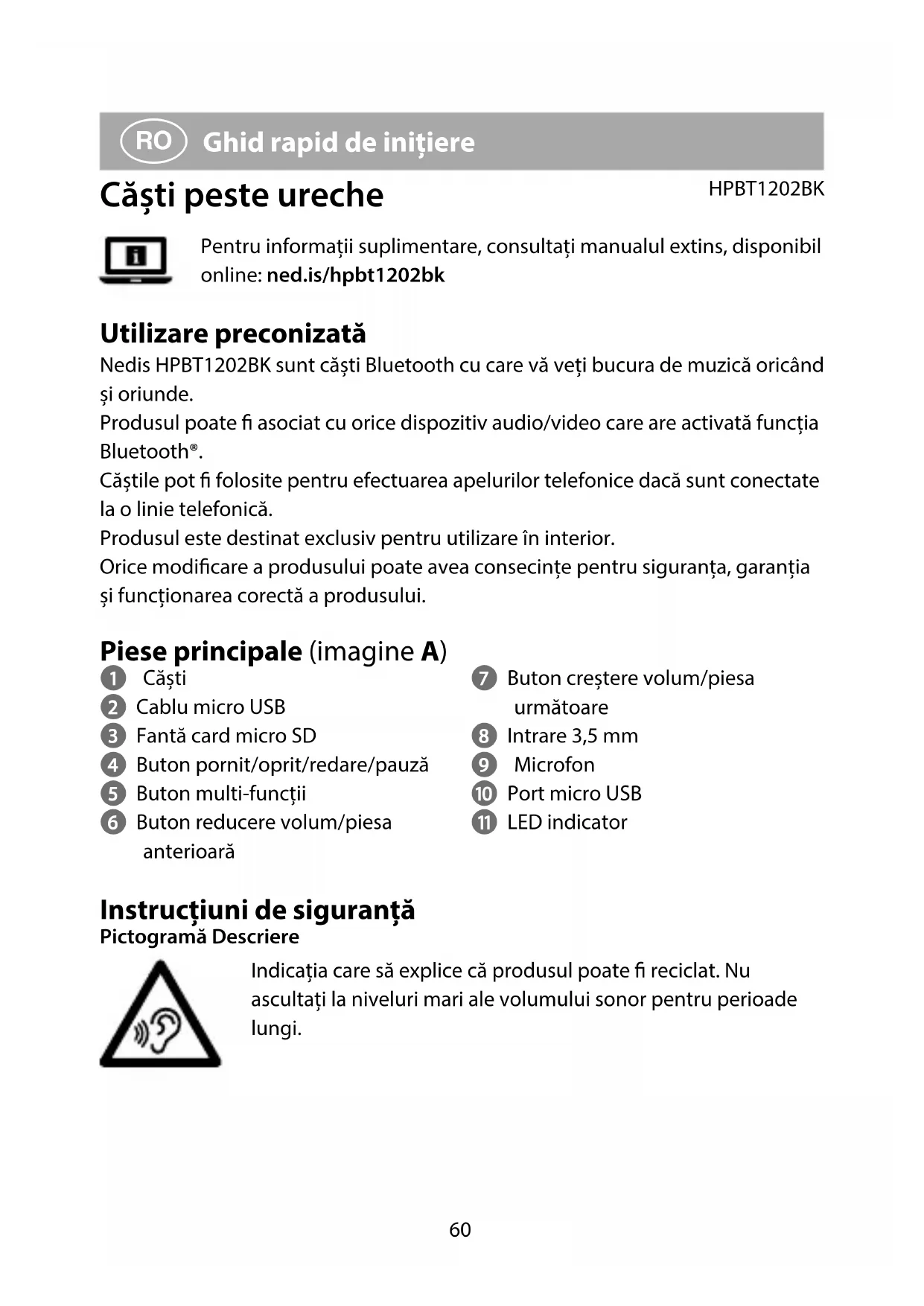 Ghid rapid de inițiere Căști peste ureche HPBT1202BK Pentru informații suplimentare, consultați manualul extins, disponibil online: ned.is/hpbt1202bk Utilizare preconizată Nedis HPBT1202BK sunt căști Bluetooth cu care vă veți bucura de muzică oricând și oriunde. Produsul poate asociat cu orice dispozitiv audio/video care are activată funcția Bluetooth®. Căștile pot folosite pentru efectuarea apelurilor telefonice dacă sunt conectate la o linie telefonică. Produsul este destinat exclusiv pentru utilizare în interior. Orice modicare a produsului poate avea consecințe pentru siguranța, garanția și funcționarea corectă a produsului. Piese principale (imagine A) 1 Căști 2 Cablu micro USB 3 Fantă card micro SD 4 Buton pornit/oprit/redare/pauză 5 Buton multi-funcții 6 Buton reducere volum/piesa anterioară 7 Buton creștere volum/piesa următoare 8 Intrare 3,5 mm 9 Microfon q Port micro USB w LED indicator Instrucțiuni de siguranță Pictogramă Descriere Indicația care să explice că produsul poate reciclat. Nu ascultați la niveluri mari ale volumului sonor pentru perioade lungi.61