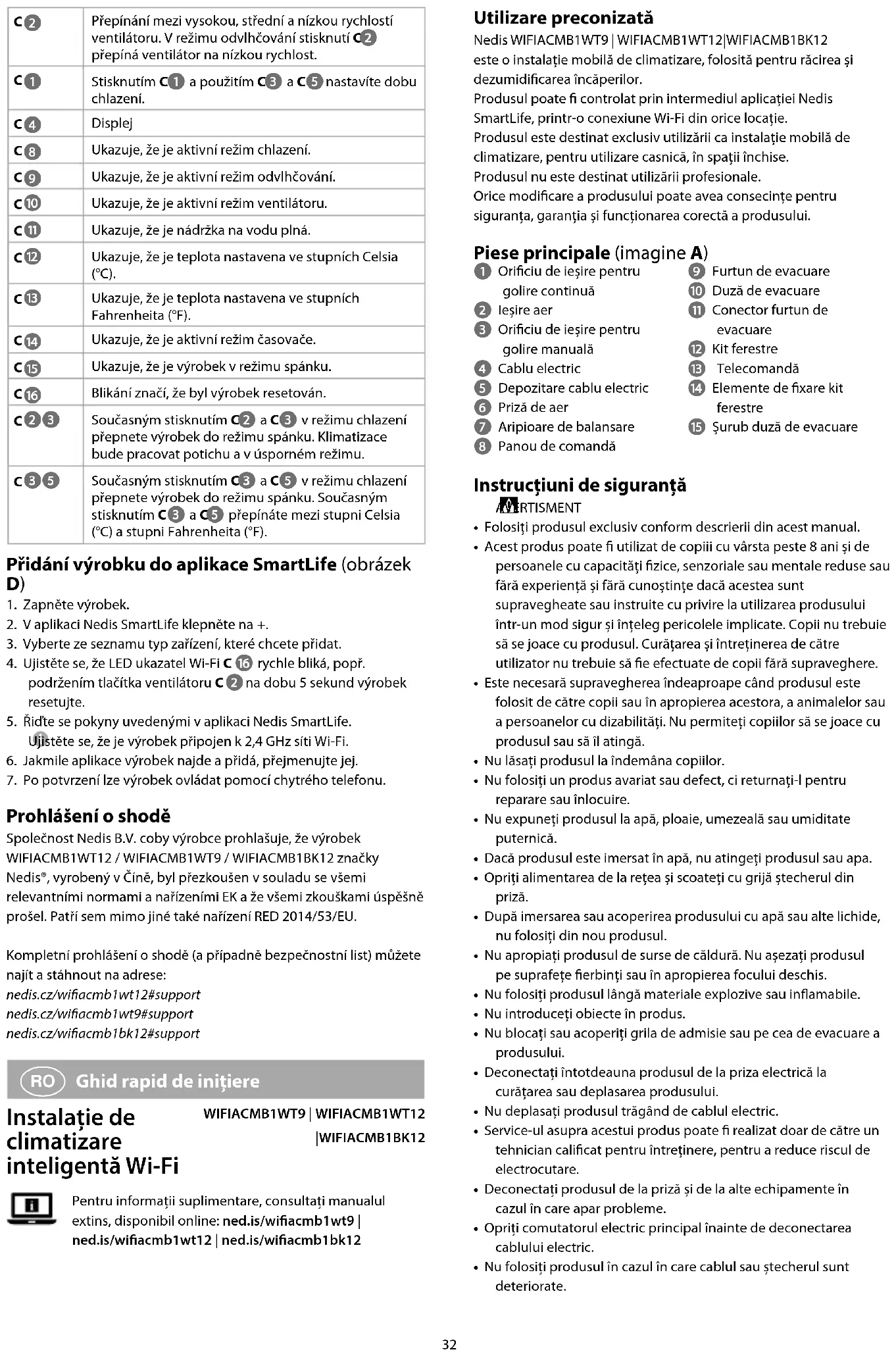 - Výrobek skladujte tak, abyste zabránili jeho mechanickému poškození.32 Utilizare preconizată Nedis WIFIACMB1WT9 | WIFIACMB1WT12|WIFIACMB1BK12 este o instalație mobilă de climatizare, folosită pentru răcirea și dezumidicarea încăperilor.Produsul poate controlat prin intermediul aplicației Nedis SmartLife, printr-o conexiune Wi-Fi din orice locație.Produsul este destinat exclusiv utilizării ca instalație mobilă de climatizare, pentru utilizare casnică, în spații închise.Produsul nu este destinat utilizării profesionale.Orice modicare a produsului poate avea consecințe pentru siguranța, garanția și funcționarea corectă a produsului. Piese principale (imagine A) 1 Oriciu de ieșire pentru golire continuă2 Ieșire aer3 Oriciu de ieșire pentru golire manuală4 Cablu electric5 Depozitare cablu electric6 Priză de aer7 Aripioare de balansare8 Panou de comandă9 Furtun de evacuareq Duză de evacuarew Conector furtun de evacuaree Kit ferestrer Telecomandăt Elemente de xare kit ferestrey Șurub duză de evacuare Instrucțiuni de siguranță