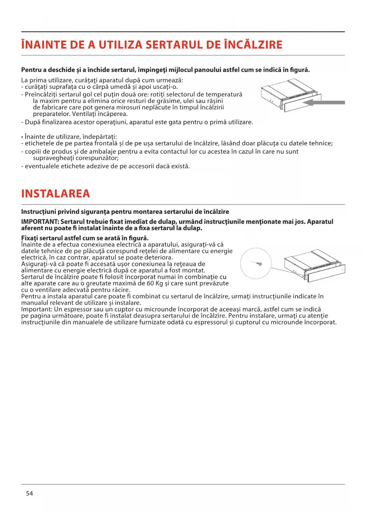 - Înainte de utilizare, îndepărtaţi: - etichetele de pe partea frontală și de pe ușa sertarului de încălzire, lăsând doar plăcuţa cu datele tehnice; - copiii de produs și de ambalaje pentru a evita contactul lor cu acestea în cazul în care nu sunt supravegheaţi corespunzător; - eventualele etichete adezive de pe accesorii dacă există. INSTALAREA Instrucţiuni privind siguranţa pentru montarea sertarului de încălzire IMPORTANT: Sertarul trebuie xat imediat de dulap, urmând instrucţiunile menţionate mai jos. Aparatul aferent nu poate instalat înainte de a xa sertarul la dulap. Fixaţi sertarul astfel cum se arată în gură. Înainte de a efectua conexiunea electrică a aparatului, asiguraţi-vă că datele tehnice de pe plăcuţă corespund reţelei de alimentare cu energie electrică, în caz contrar, aparatul se poate deteriora. Asiguraţi-vă că poate fi accesată ușor conexiunea la reţeaua de alimentare cu energie electrică după ce aparatul a fost montat. Sertarul de încălzire poate fi folosit încorporat numai în combinaţie cu alte aparate care au o greutate maximă de 60 Kg și care sunt prevăzute cu o ventilare adecvată pentru răcire. Pentru a instala aparatul care poate fi combinat cu sertarul de încălzire, urmaţi instrucţiunile indicate în manualul relevant de utilizare și instalare. Important: Un espressor sau un cuptor cu microunde încorporat de aceeași marcă, astfel cum se indică pe pagina următoare, poate fi instalat deasupra sertarului de încălzire. Pentru instalare, urmaţi cu atenţie instrucţiunile din manualele de utilizare furnizate odată cu espressorul și cuptorul cu microunde încorporat.RO