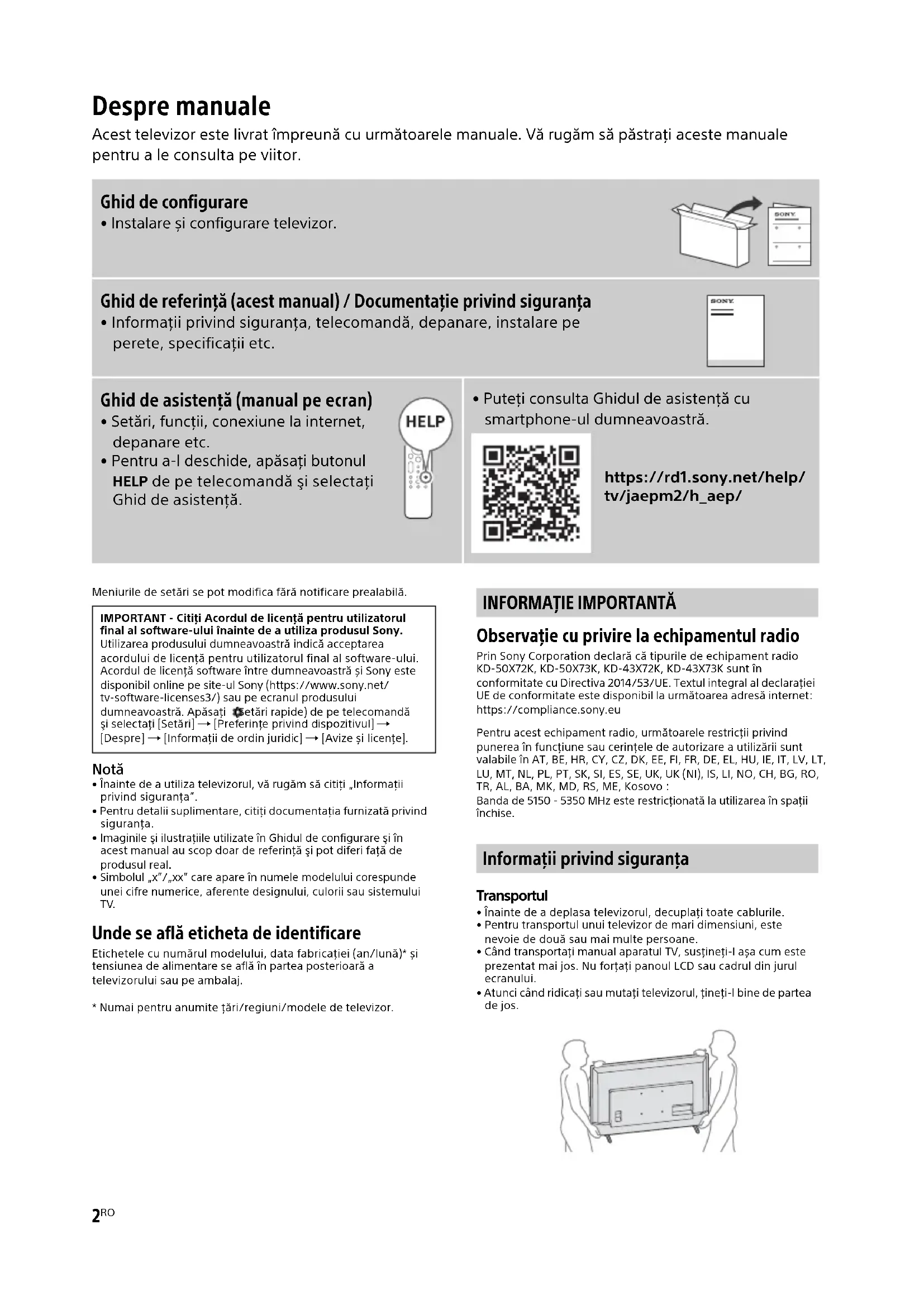 - Numai pentru anumite ţări/regiuni/modele de televizor. Observaţie cu privire la echipamentul radio Prin Sony Corporation declară că tipurile de echipament radio KD-50X72K, KD-50X73K, KD-43X72K, KD-43X73K sunt în conformitate cu Directiva 2014/53/UE. Textul integral al declarației UE de conformitate este disponibil la următoarea adresă internet: https://compliance.sony.eu Pentru acest echipament radio, următoarele restricţii privind punerea în funcţiune sau cerinţele de autorizare a utilizării sunt valabile în AT, BE, HR, CY, CZ, DK, EE, FI, FR, DE, EL, HU, IE, IT, LV, LT, LU, MT, NL, PL, PT, SK, SI, ES, SE, UK, UK (NI), IS, LI, NO, CH, BG, RO, TR, AL, BA, MK, MD, RS, ME, Kosovo : Banda de 5150 - 5350 MHz este restricţionată la utilizarea în spaţii închise. Transportul