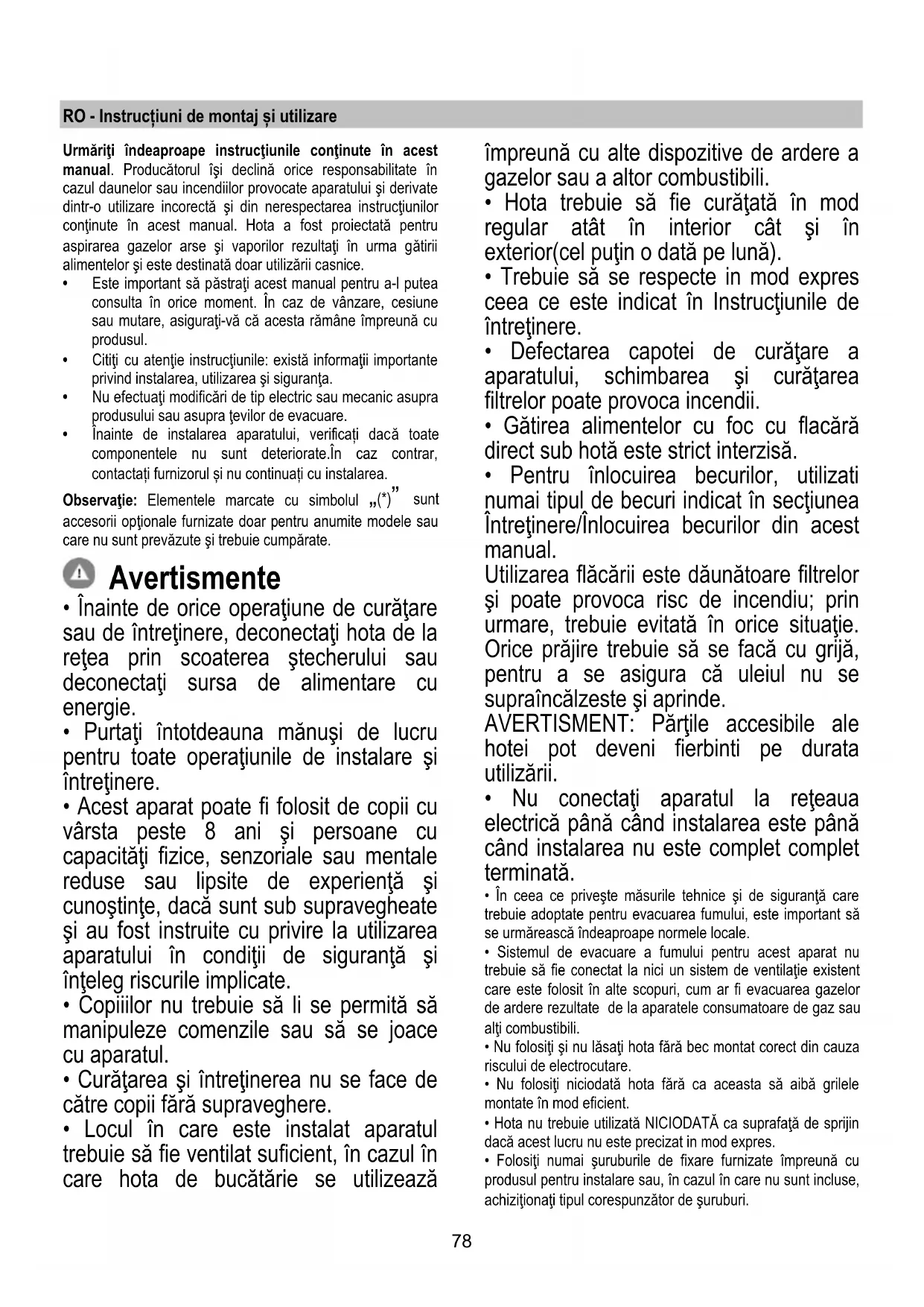 - Pentru înlocuirea becurilor, utilizati numai tipul de becuri indicat în secţiunea Întreţinere/Înlocuirea becurilor din acest manual. Utilizarea flăcării este dăunătoare filtrelor şi poate provoca risc de incendiu; prin urmare, trebuie evitată în orice situaţie. Orice prăjire trebuie să se facă cu grijă, pentru a se asigura că uleiul nu se supraîncălzeste şi aprinde. AVERTISMENT: Părţile accesibile ale hotei pot deveni fierbinti pe durata utilizării.
