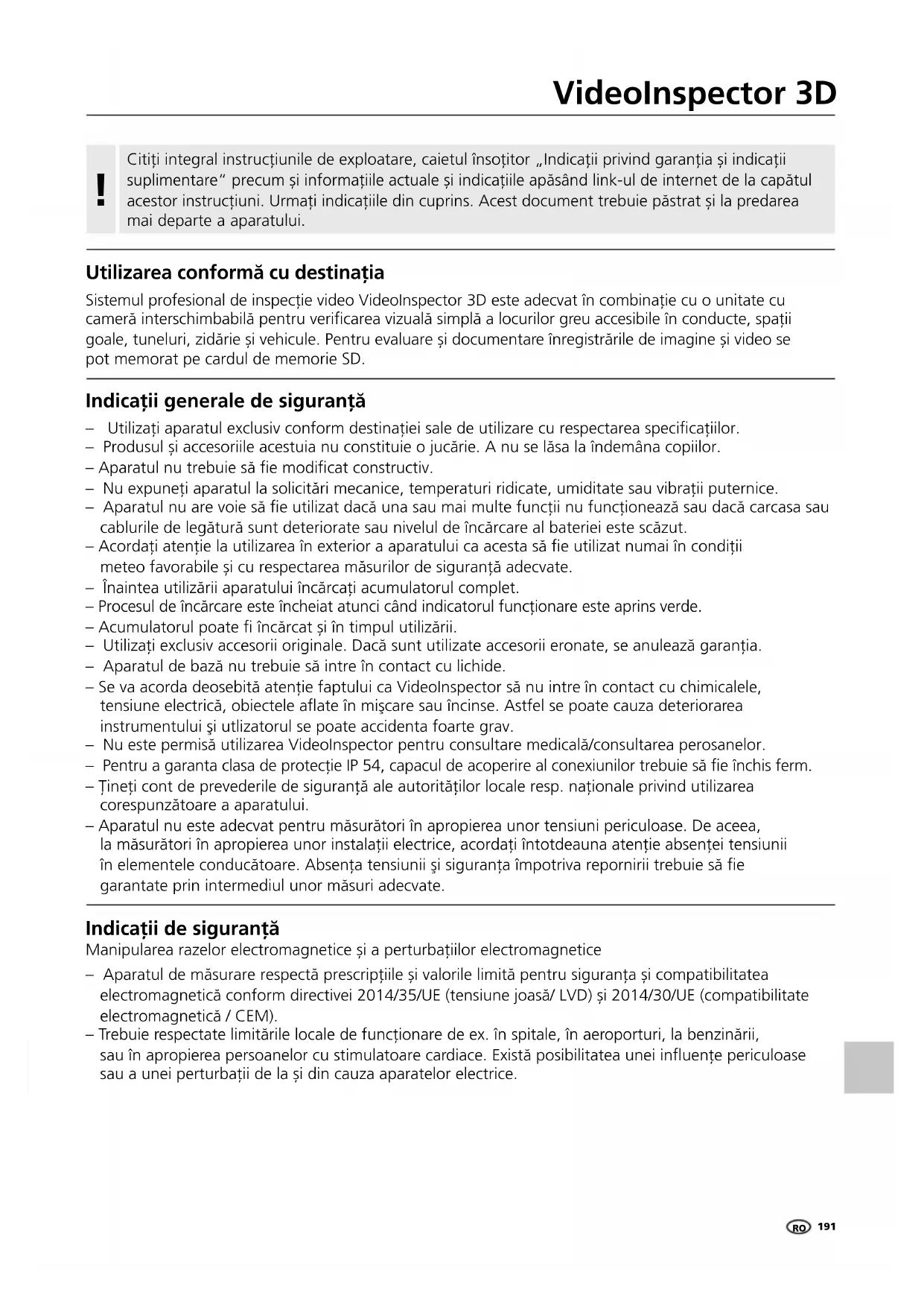 Indicaţii de siguranţă Manipularea razelor electromagnetice și a perturbațiilor electromagnetice – Aparatul de măsurare respectă prescripțiile și valorile limită pentru siguranța și compatibilitatea electromagnetică conform directivei 2014/35/UE (tensiune joasă/ LVD) și 2014/30/UE (compatibilitate electromagnetică / CEM). – Trebuie respectate limitările locale de funcționare de ex. în spitale, în aeroporturi, la benzinării, sau în apropierea persoanelor cu stimulatoare cardiace. Există posibilitatea unei inuențe periculoase sau a unei perturbații de la și din cauza aparatelor electrice. Indicaţii generale de siguranţă – Utilizaţi aparatul exclusiv conform destinaţiei sale de utilizare cu respectarea specicaţiilor. – Produsul și accesoriile acestuia nu constituie o jucărie. A nu se lăsa la îndemâna copiilor. – Aparatul nu trebuie să e modicat constructiv. – Nu expuneţi aparatul la solicitări mecanice, temperaturi ridicate, umiditate sau vibraţii puternice. – Aparatul nu are voie să e utilizat dacă una sau mai multe funcții nu funcționează sau dacă carcasa sau cablurile de legătură sunt deteriorate sau nivelul de încărcare al bateriei este scăzut. – Acordați atenție la utilizarea în exterior a aparatului ca acesta să e utilizat numai în condiții meteo favorabile și cu respectarea măsurilor de siguranță adecvate. – Înaintea utilizării aparatului încărcaţi acumulatorul complet. – Procesul de încărcare este încheiat atunci când indicatorul funcționare este aprins verde. – Acumulatorul poate încărcat și în timpul utilizării. – Utilizați exclusiv accesorii originale. Dacă sunt utilizate accesorii eronate, se anulează garanția. – Aparatul de bază nu trebuie să intre în contact cu lichide. – Se va acorda deosebită atenţie faptului ca VideoInspector să nu intre în contact cu chimicalele, tensiune electrică, obiectele aate în mişcare sau încinse. Astfel se poate cauza deteriorarea instrumentului şi utlizatorul se poate accidenta foarte grav. – Nu este permisă utilizarea VideoInspector pentru consultare medicală/consultarea perosanelor. – Pentru a garanta clasa de protecție IP 54, capacul de acoperire al conexiunilor trebuie să e închis ferm. – Ţineţi cont de prevederile de siguranţă ale autorităţilor locale resp. naţionale privind utilizarea corespunzătoare a aparatului. – Aparatul nu este adecvat pentru măsurători în apropierea unor tensiuni periculoase. De aceea, la măsurători în apropierea unor instalaţii electrice, acordaţi întotdeauna atenţie absenţei tensiunii în elementele conducătoare. Absenţa tensiunii şi siguranţa împotriva repornirii trebuie să e garantate prin intermediul unor măsuri adecvate.192