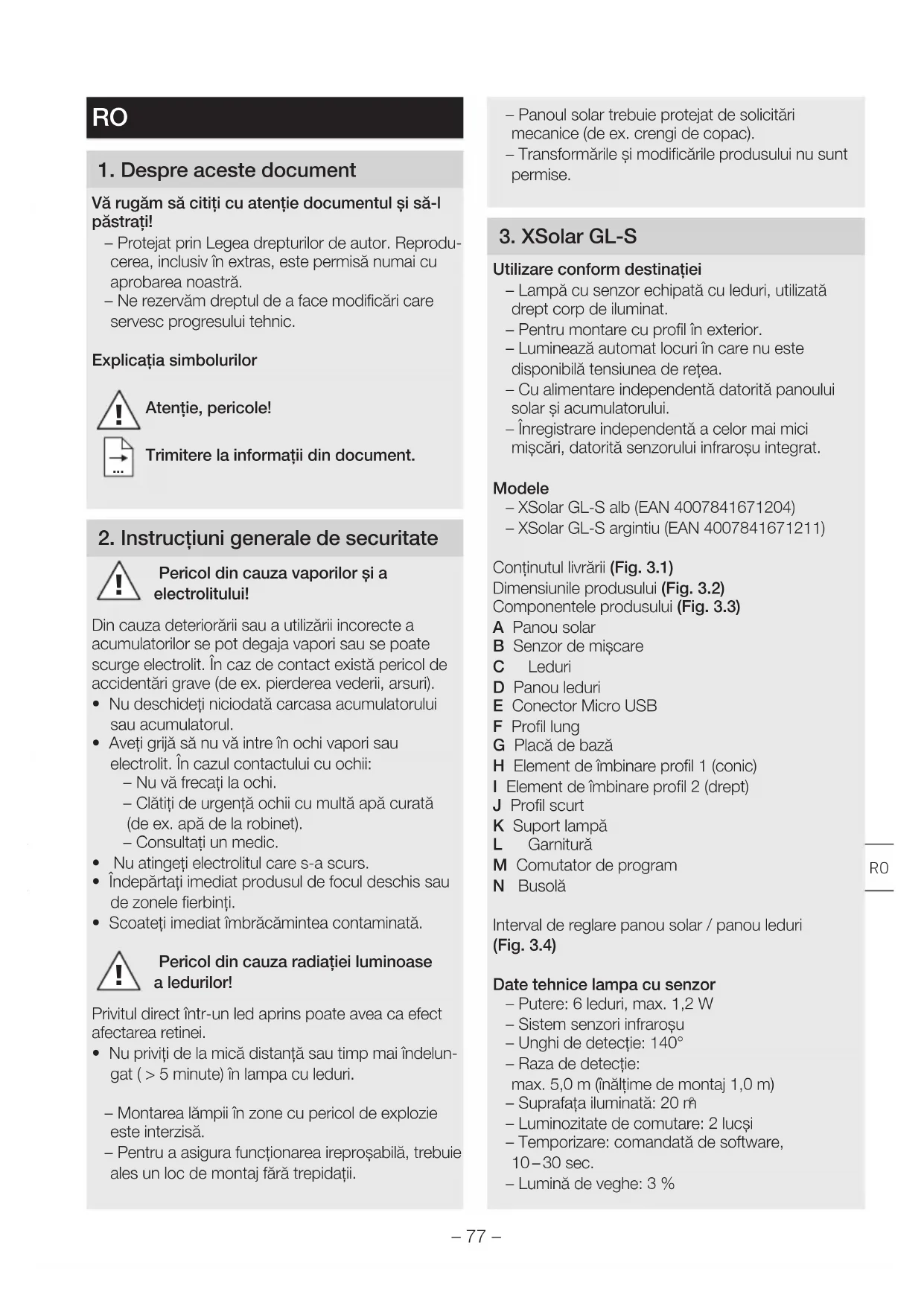 Utilizare conform destinaţiei – Lampă cu senzor echipată cu leduri, utilizată drept corp de iluminat. – Pentru montare cu profil în exterior. – Luminează automat locuri în care nu este disponibilă tensiunea de reţea. – Cu alimentare independentă datorită panoului solar şi acumulatorului. – Înregistrare independentă a celor mai mici mişcări, datorită senzorului infraroşu integrat. Modele – XSolar GL-S alb (EAN4007841671204) – XSolar GL-S argintiu (EAN4007841671211) Conținutul livrării (Fig. 3.1) Dimensiunile produsului (Fig. 3.2) Componentele produsului (Fig. 3.3) A Panou solar B Senzor de mişcare C Leduri D Panou leduri E Conector Micro USB F Profil lung G Placă de bază H Element de îmbinare profil 1 (conic) I Element de îmbinare profil 2 (drept) J Profil scurt K Suport lampă L Garnitură M Comutator de program N Busolă Interval de reglare panou solar/panou leduri (Fig. 3.4) Date tehnice lampa cu senzor – Putere: 6 leduri, max. 1,2 W – Sistem senzori infraroşu – Unghi de detecţie: 140° – Raza de detecţie: max. 5,0 m (înălţime de montaj 1,0 m) – Suprafaţa iluminată: 20 m