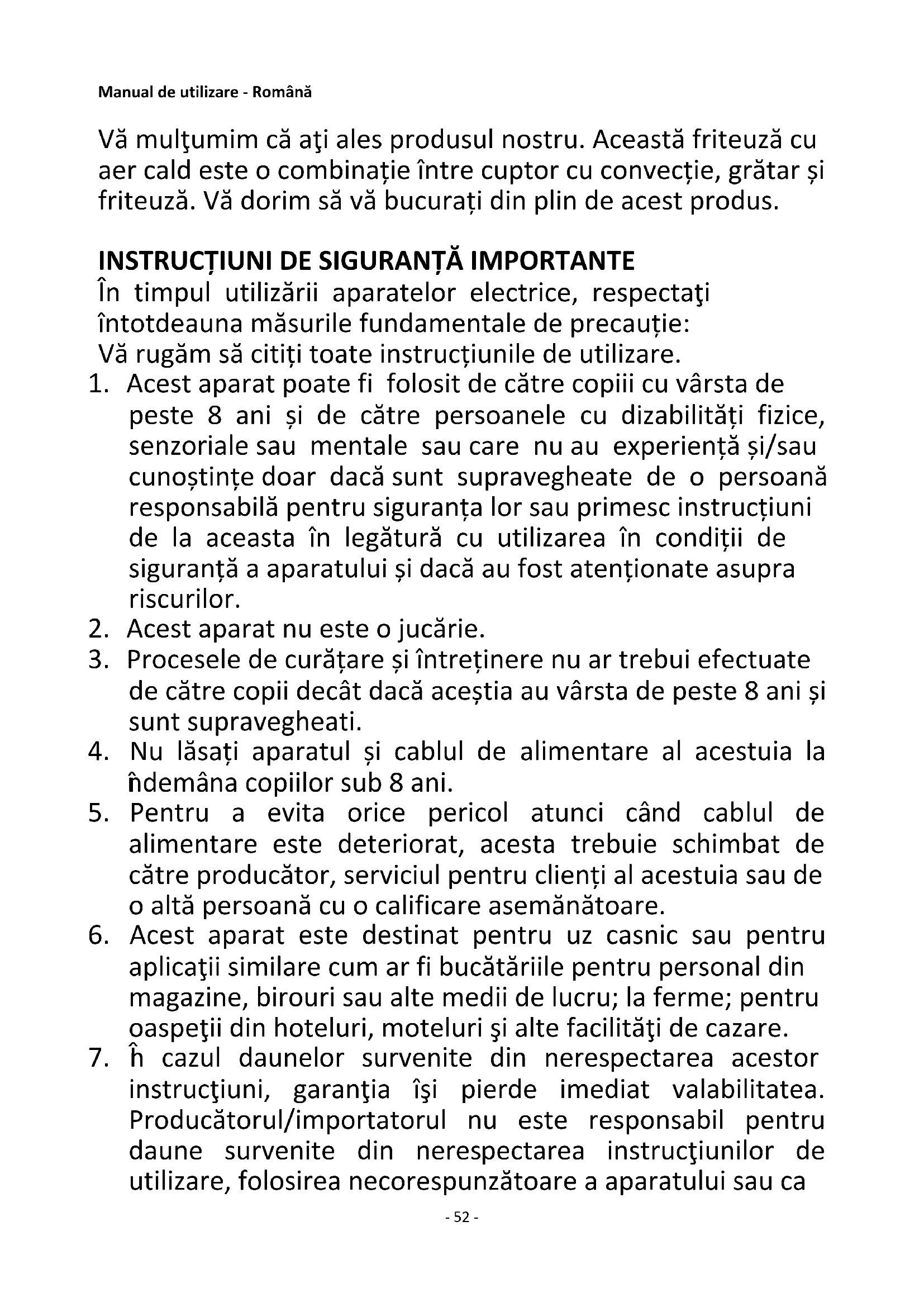 instrucţiuni, garanţia îşi pierde imediat valabilitatea. Producătorul/importatorul nu este responsabil pentru daune survenite din nerespectarea instrucţiunilor de utilizare, folosirea necorespunzătoare a aparatului sau ca- 53 - urmare a utilizării neconforme cu instrucțiunile din acest manual de utiilizare.