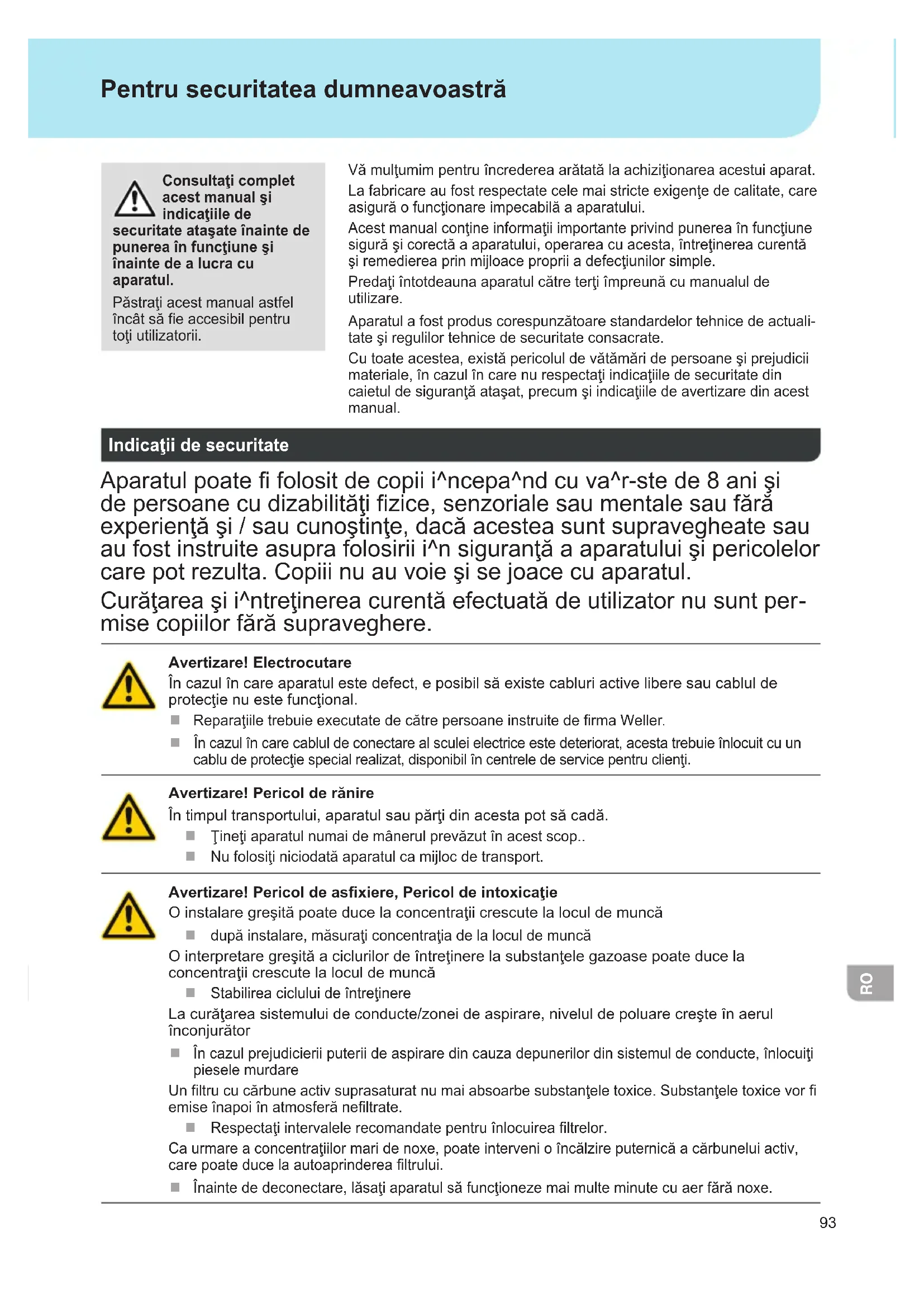 misecopiilorfărăsupraveghere. Avertizare! Electrocutare Încazulîncareaparatulestedefect,eposibilsăexistecabluriactiveliberesaucablulde protecţienuestefuncţional. ReparaţiiletrebuieexecutatedecătrepersoaneinstruitedermaWeller. Încazulîncarecabluldeconectarealsculeielectriceestedeteriorat,acestatrebuieînlocuitcuun cabludeprotecţiespecialrealizat,disponibilîncentreledeservicepentruclienţi. Avertizare! Pericol de rănire Întimpultransportului,aparatulsaupărţidinacestapotsăcadă. Ţineţiaparatulnumaidemânerulprevăzutînacestscop.. Nufolosiţiniciodatăaparatulcamijlocdetransport. Avertizare! Pericol de asxiere, Pericol de intoxicaţie Oinstalaregreşităpoateducelaconcentraţiicrescutelaloculdemuncă dupăinstalare,măsuraţiconcentraţiadelaloculdemuncă Ointerpretaregreşităaciclurilordeîntreţinerelasubstanţelegazoasepoateducela concentraţiicrescutelaloculdemuncă Stabilireacicluluideîntreţinere Lacurăţareasistemuluideconducte/zoneideaspirare,niveluldepoluarecreşteînaerul înconjurător Încazulprejudicieriiputeriideaspiraredincauzadepunerilordinsistemuldeconducte,înlocuiţi piesele murdare Unltrucucărbuneactivsuprasaturatnumaiabsoarbesubstanţeletoxice. Substanţeletoxicevor emiseînapoiînatmosferăneltrate. Respectaţiintervalelerecomandatepentruînlocuirealtrelor. Caurmareaconcentraţiilormaridenoxe,poateintervenioîncălzireputernicăacărbuneluiactiv, carepoateducelaautoaprinderealtrului. Înaintededeconectare,lăsaţiaparatulsăfuncţionezemaimulteminutecuaerfărănoxe.94