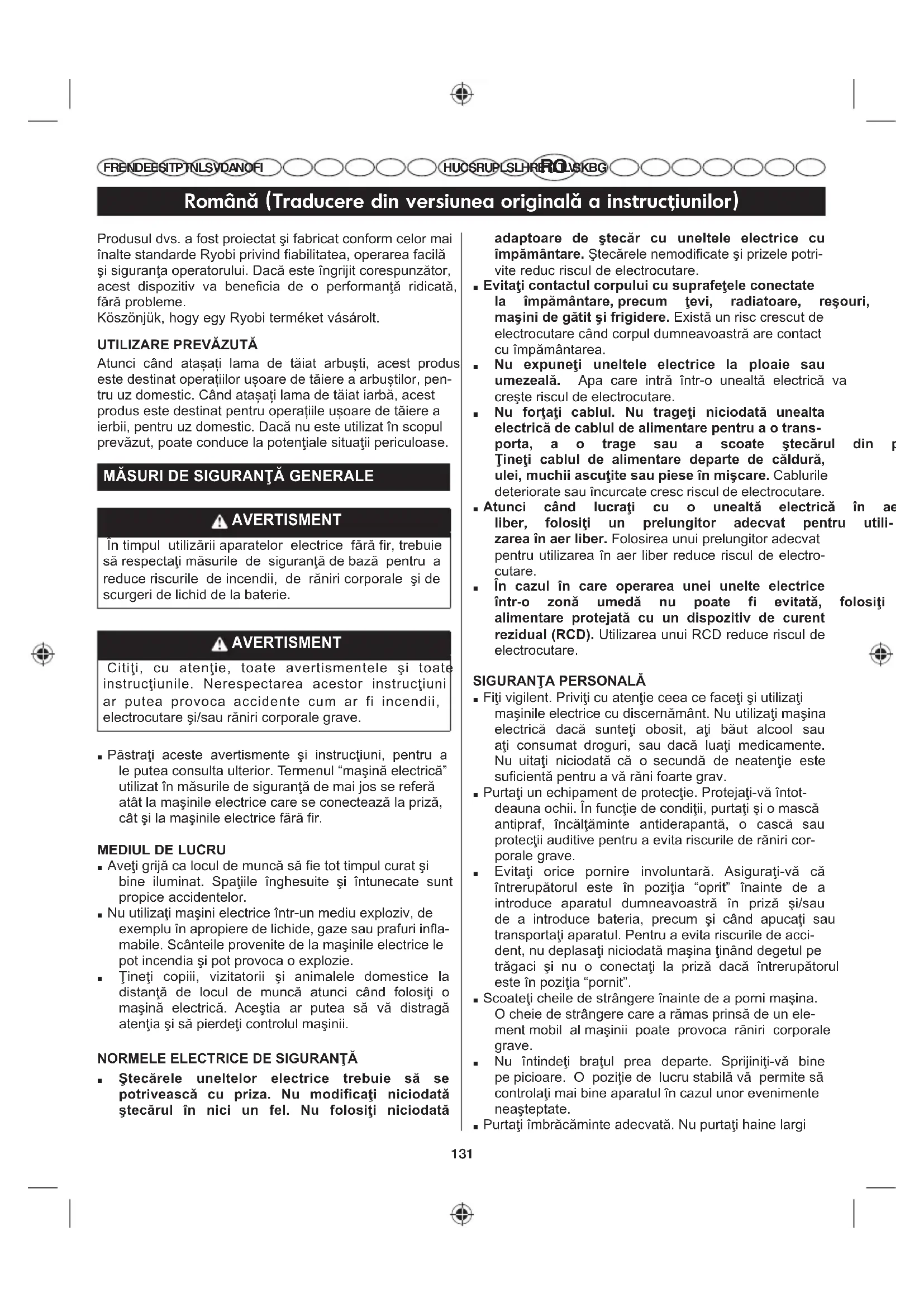 HU CS RU PL SL HR ET LT LV SK BG Produsul dvs. a fost proiectat şi fabricat conform celor mai înalte standarde Ryobi privind fiabilitatea, operarea facilă şi siguranţa operatorului. Dacă este îngrijit corespunzător, acest dispozitiv va beneficia de o performanţă ridicată, fără probleme. Köszönjük, hogy egy Ryobi terméket vásárolt. 87,/,=$5(35(9Ă=87Ă Atunci când atașați lama de tăiat arbuști, acest produs este destinat operațiilor ușoare de tăiere a arbuștilor, pen- tru uz domestic. Când atașați lama de tăiat iarbă, acest produs este destinat pentru operațiile ușoare de tăiere a ierbii, pentru uz domestic. Dacă nu este utilizat în scopul prevăzut, poate conduce la potenţiale situaţii periculoase. 0Ă685,'(6,*85$1ğĂ*(1(5$/( AVERTISMENT În timpul utilizării aparatelor electrice fără fir, trebuie să respectaţi măsurile de siguranţă de bază pentru a reduce riscurile de incendii, de răniri corporale şi de scurgeri de lichid de la baterie. AVERTISMENT Citiţi, cu atenţie, toate avertismentele şi toate instrucţiunile. Nerespectarea acestor instrucţiuni ar putea provoca accidente cum ar fi incendii, electrocutare şi/sau răniri corporale grave. ■ Păstraţi aceste avertismente şi instrucţiuni, pentru a le putea consulta ulterior. Termenul “maşină electrică” utilizat în măsurile de siguranţă de mai jos se referă atât la maşinile electrice care se conectează la priză, cât şi la maşinile electrice fără fir.