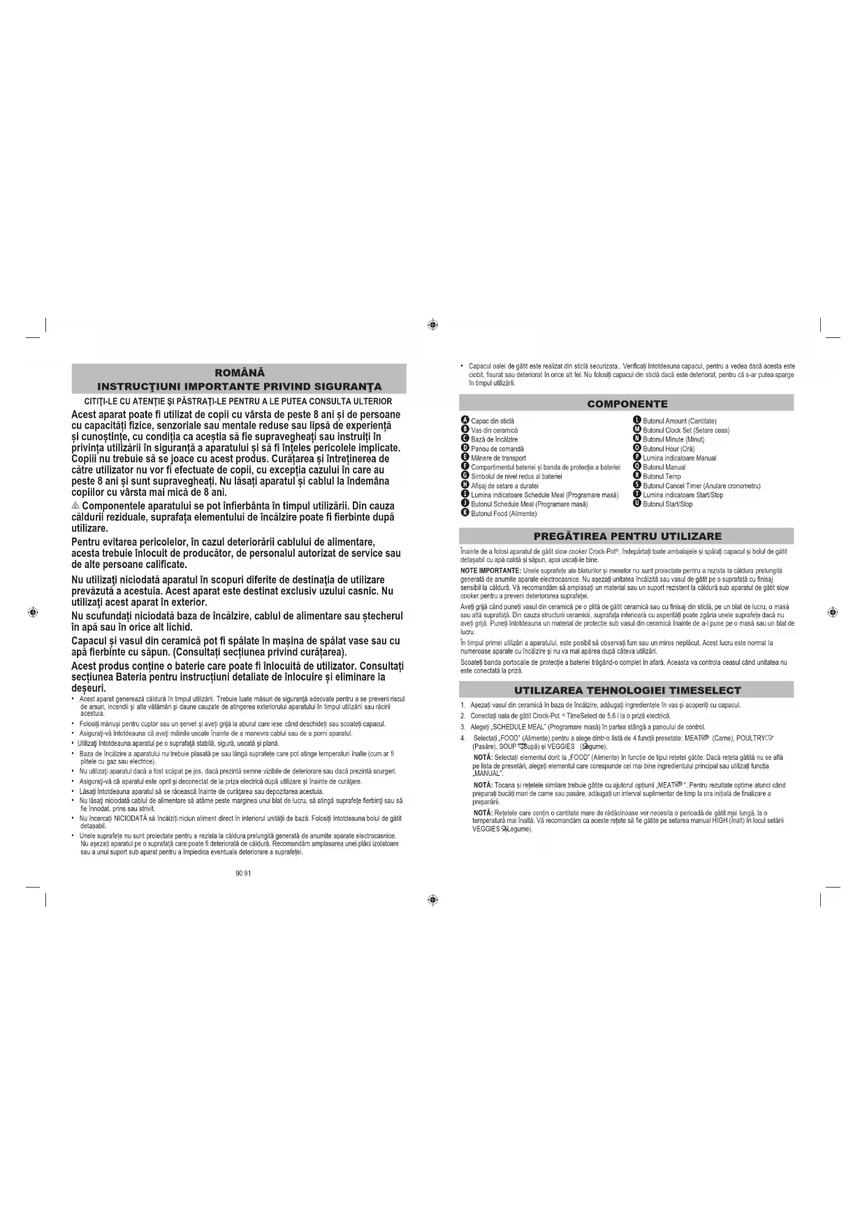 (Pasăre), SOUP (Supă) și VEGGIES (Legume). NOTĂ: Selectați elementul dorit la „FOOD” (Alimente) în funcție de tipul rețetei gătite. Dacă rețeta gătită nu se află pe lista de presetări, alegeți elementul care corespunde cel mai bine ingredientului principal sau utilizați funcția „MANUAL”. NOTĂ: Tocana și rețetele similare trebuie gătite cu ajutorul opțiunii „MEAT ”. Pentru rezultate optime atunci când preparați bucăți mari de carne sau pasăre, adăugați un interval suplimentar de timp la ora inițială de finalizare a preparării. NOTĂ: Rețetele care conțin o cantitate mare de rădăcinoase vor necesita o perioadă de gătit mai lungă, la o temperatură mai înaltă. Vă recomandăm ca aceste rețete să fie gătite pe setarea manual HIGH (Înalt) în locul setării VEGGIES (Legume). A Capac din sticlă B Vas din ceramică C Bază de încălzire D Panou de comandă E Mânere de transport F Compartimentul bateriei și banda de protecție a bateriei G Simbolul de nivel redus al bateriei H Afișaj de setare a duratei I Lumina indicatoare Schedule Meal (Programare masă) J Butonul Schedule Meal (Programare masă) K Butonul Food (Alimente) L Butonul Amount (Cantitate) M Butonul Clock Set (Setare ceas) N Butonul Minute (Minut) O Butonul Hour (Oră) P Lumina indicatoare Manual Q Butonul Manual R Butonul Temp S Butonul Cancel Timer (Anulare cronometru) T Lumina indicatoare Start/Stop U Butonul Start/Stop92 93 5. Utilizați butonul „AMOUNT” (Cantitate) pentru a selecta greutatea sau volumul alimentelor preparate. Dacă ați selectat „MEAT ” (Carne) sau „POULTRY ” (Pasăre), oala de gătit va oferi opțiunile de greutate, respectiv „+1 KG” și „0–1 KG”. Dacă ați selectat „SOUP ” (Supă) sau „VEGGIES ” (Legume), oala de gătit va oferi opțiunile de volum, respectiv „FULL POT ” (Oală plină) și „HALF POT ” (Oală plină pe jumătate). NOTĂ: Opțiunea „FULL POT ” (Oală plină) se referă la o oală de gătit plină în proporție de ¾. 6. Apoi, utilizați butoanele „HOUR” (Oră) și „MINUTE” (Minut) pentru a selecta ora la care doriți ca masa să fie gata (de ex., 8:00 PM) și apoi apăsați „START”. Ora afișată pe ecran este ora inițială de finalizare a preparării, calculată pe baza alimentelor și cantității preparate. NOTĂ: Funcția „SCHEDULE MEAL” (Programare masă) nu permite prepararea alimentelor timp de peste 12 ore de la ora de începere a preparării. Odată ce ora programată a mesei este depășită, oala de gătit va comuta automat la modul „KEEP WARM” (Menținere la cald). NOTĂ: Tehnologia TimeSelect™ determină automat setarea corectă de temperatură, pe baza informațiilor introduse mai sus. Alimentele vor fi păstrate întotdeauna la o temperatură care va preveni alterarea, exceptând cazul unei pene de curent. Pentru mai multe detalii privind situațiile în care au loc pene de curent, consultați pagina 9. UTILIZAREA FUNCȚIEI MANUALE A OALEI DE GĂTIT 1. Așezați vasul din ceramică în baza de încălzire, adăugați ingredientele în vas și acoperiți cu capacul. Conectați oala de gătit la priză și selectați butonul „MANUAL” din partea dreaptă a controlerului.
