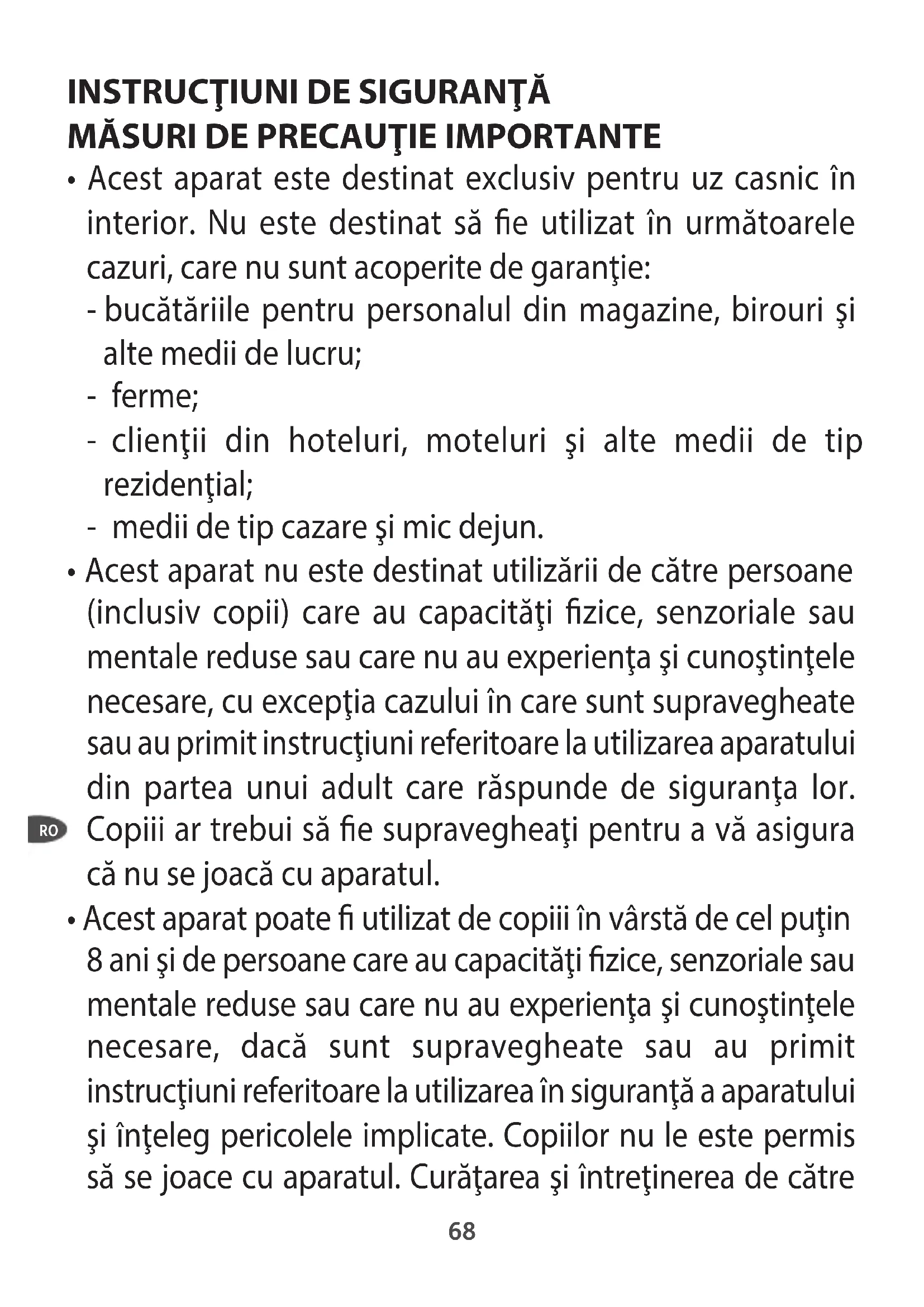 - Acest aparat poate utilizat de copiii în vârstă de cel puţin 8 ani şi de persoane care au capacităţi zice, senzoriale sau mentale reduse sau care nu au experienţa şi cunoştinţele necesare, dacă sunt supravegheate sau au primit instrucţiuni referitoare la utilizarea în siguranţă a aparatului şi înţeleg pericolele implicate. Copiilor nu le este permis să se joace cu aparatul. Curăţarea şi întreţinerea de către RO69 utilizator nu pot realizate de copii decât dacă au peste 8 ani şi sunt supravegheaţi. Nu lăsaţi aparatul şi cablul său de alimentare la îndemâna copiilor cu vârsta mai mică de 8 ani.