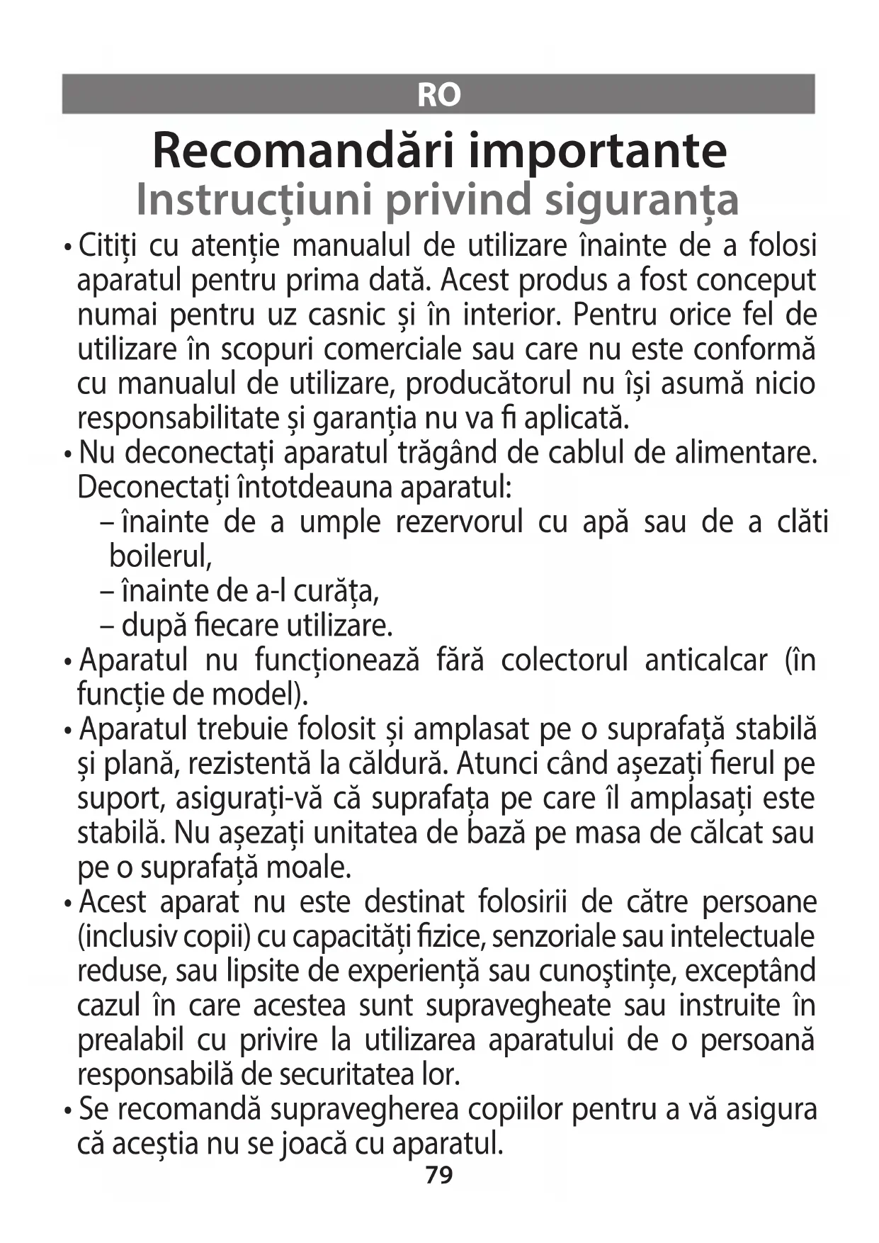 - Acest aparat poate folosit de către copii cu vârsta peste 8 ani și de către persoane lipsite de experiență sau cunoștințe, sau cu capacități zice, senzoriale sau intelectuale reduse, dacă acestea sunt supravegheate sau instruite în prealabil cu privire la utilizarea aparatului în deplină siguranță și cunosc riscurile asociate. Copiii nu trebuie să se joace cu aparatul. Copiii nu trebuie să curățe sau să întrețină aparatul nesupravegheați. Nu lăsați la îndemâna copiilor cu vârsta sub 8 ani erul de călcat și cordonul de alimentare, atunci când erul de călcat este alimentat electric sau în curs de răcire.