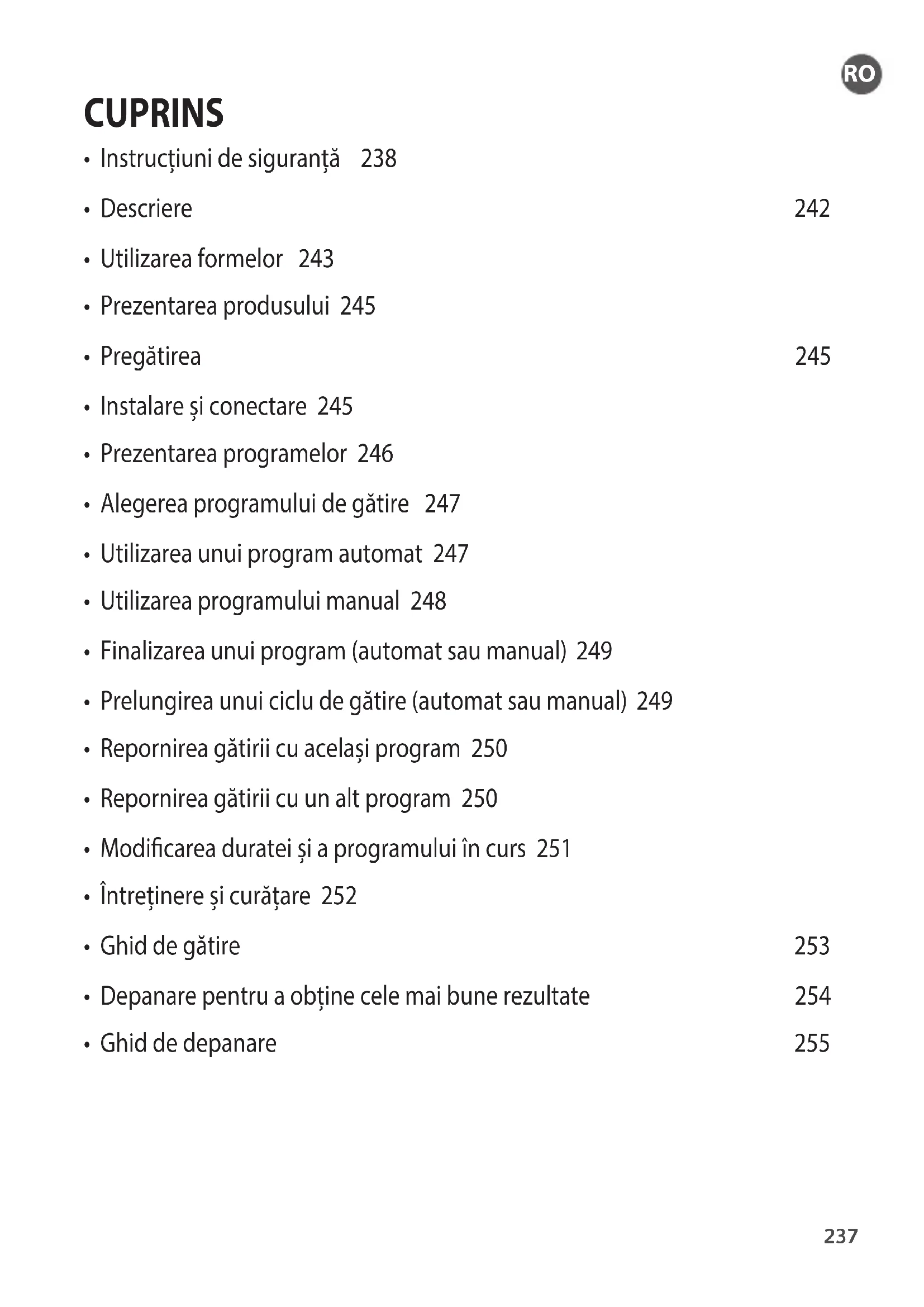- Prelungirea unui ciclu de gătire (automat sau manual) 249