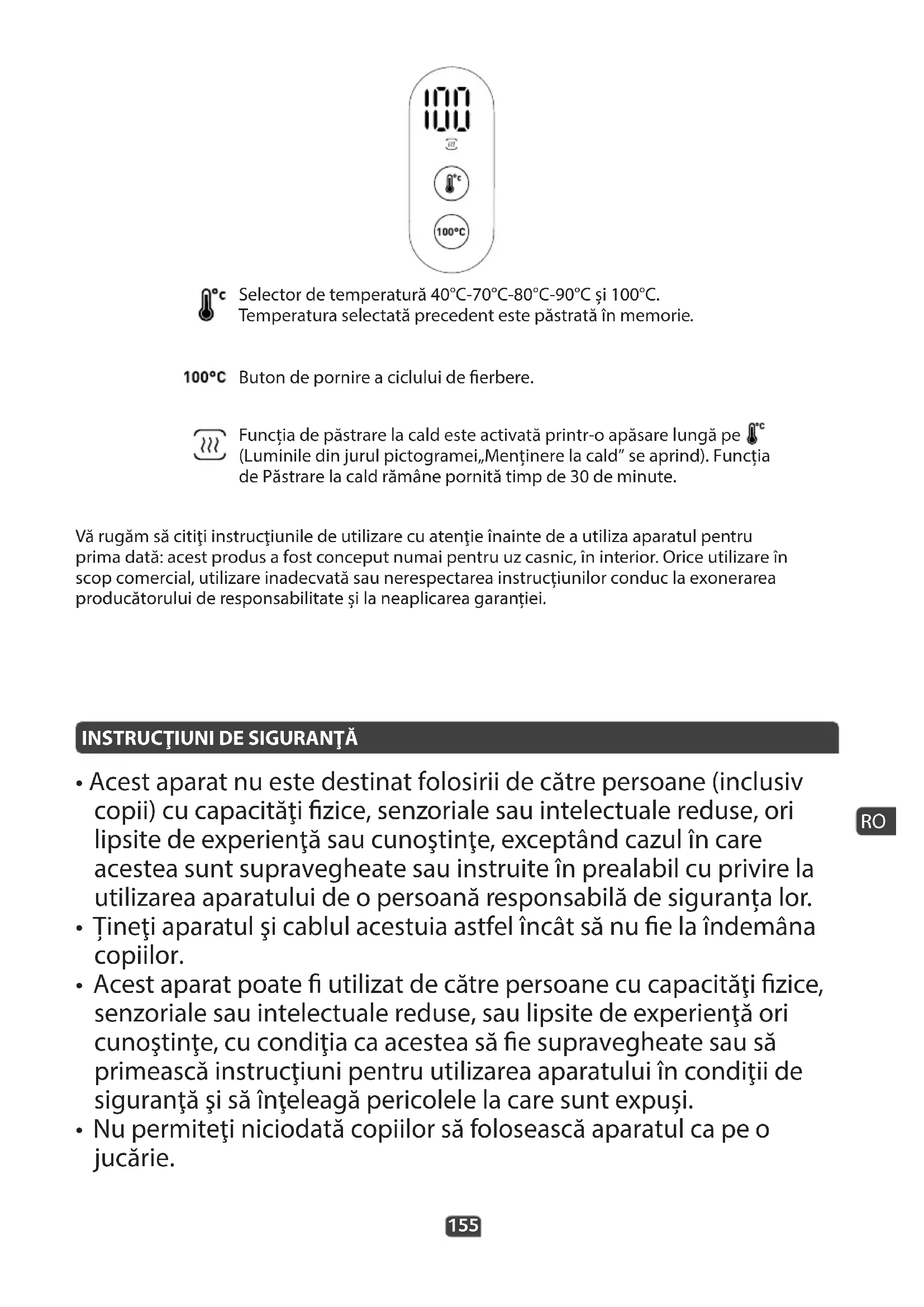 - Acest aparat nu este destinat folosirii de către persoane (inclusiv copii) cu capacităţi zice, senzoriale sau intelectuale reduse, ori lipsite de experienţă sau cunoştinţe, exceptând cazul în care acestea sunt supravegheate sau instruite în prealabil cu privire la utilizarea aparatului de o persoană responsabilă de siguranța lor.