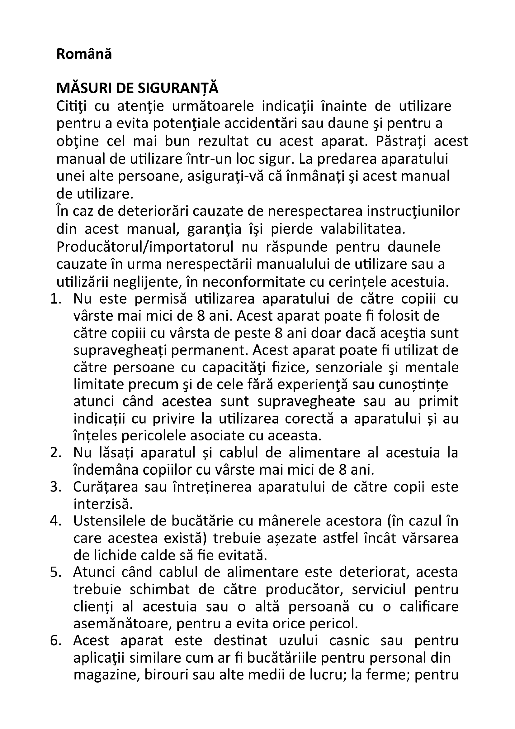 vârste mai mici de 8 ani. Acest aparat poate fi folosit de către copiii cu vârsta de peste 8 ani doar dacă aceştia sunt supravegheați permanent. Acest aparat poate fi utilizat de către persoane cu capacităţi fizice, senzoriale şi mentale limitate precum şi de cele fără experienţă sau cunoștințe atunci când acestea sunt supravegheate sau au primit indicații cu privire la utilizarea corectă a aparatului și au înțeles pericolele asociate cu aceasta.