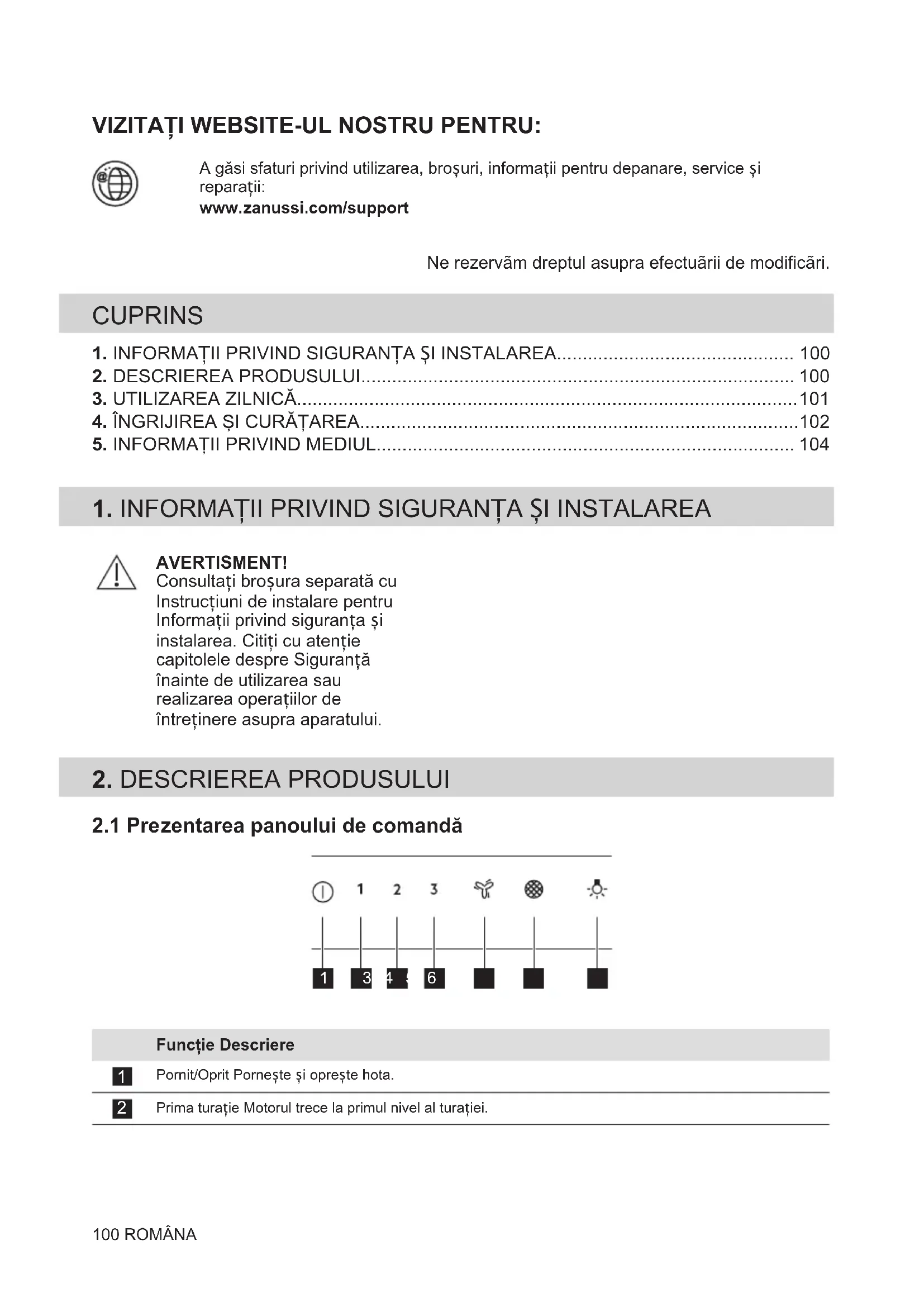 Descărcați instrucțiunile pentru Hotă de bucătărie în format PDF gratuit! Găsiți manualul dvs. ZFV726K - ZANUSSI și luați din nou în mână dispozitivul dvs. electronic. Pe această pagină sunt publicate toate documentele necesare pentru utilizarea dispozitivului dvs. ZFV726K mărcii ZANUSSI.